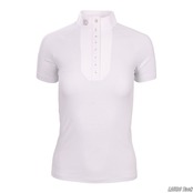 エレガントな冬のコレクションから登場したレディース競技用シャツです。伸縮性に優れた4方向ストレッチ素材を採用しまるで第二の肌のように体にフィットします。動きやすく通気性も高いため長時間の着用でも快適です。立ち襟のデザインには七つの隠しスナップボタンが配置され一番上のボタンのみ通常の仕様になっています。襟にはきらめくラインストーンの装飾が施され品のある輝きが首元を彩ります。短めの袖とすっきりとしたシルエットで競技会の装いを格上げする一枚です。