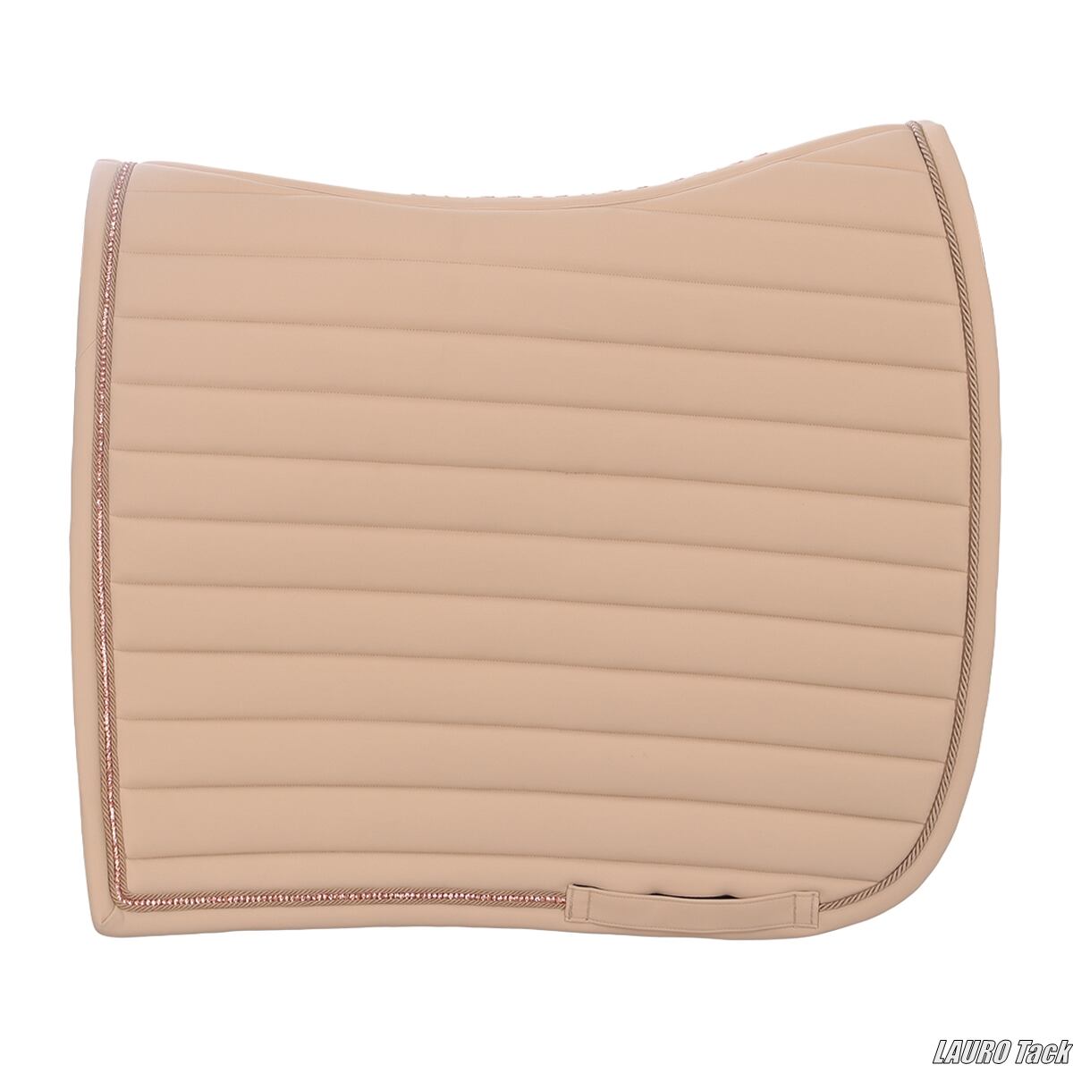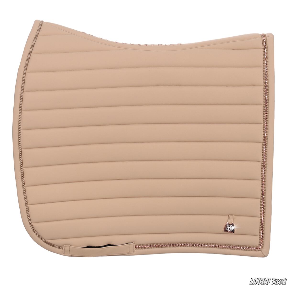 高品質なコットンと竹繊維の裏地を採用した馬場用ゼッケンです。吸湿性と通気性に優れ馬の背中を常に快適に保ちます。中綿には一〇ミリフォームと二〇〇グラムのポリフィルを使用し衝撃吸収性を高めています。首元に沿うように設計された形状で鞍下でも安定したフィット感を実現しています。ベルト通し部分は三重構造でしっかりと固定できます。前縁には装飾コードが施されさらに腹帯ループから背ラインまでの部分には二重の装飾コードとストーンをあしらった贅沢な仕上げです。片側の角にはブランドバッジが付いており上品な存在感を放ちます。