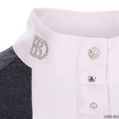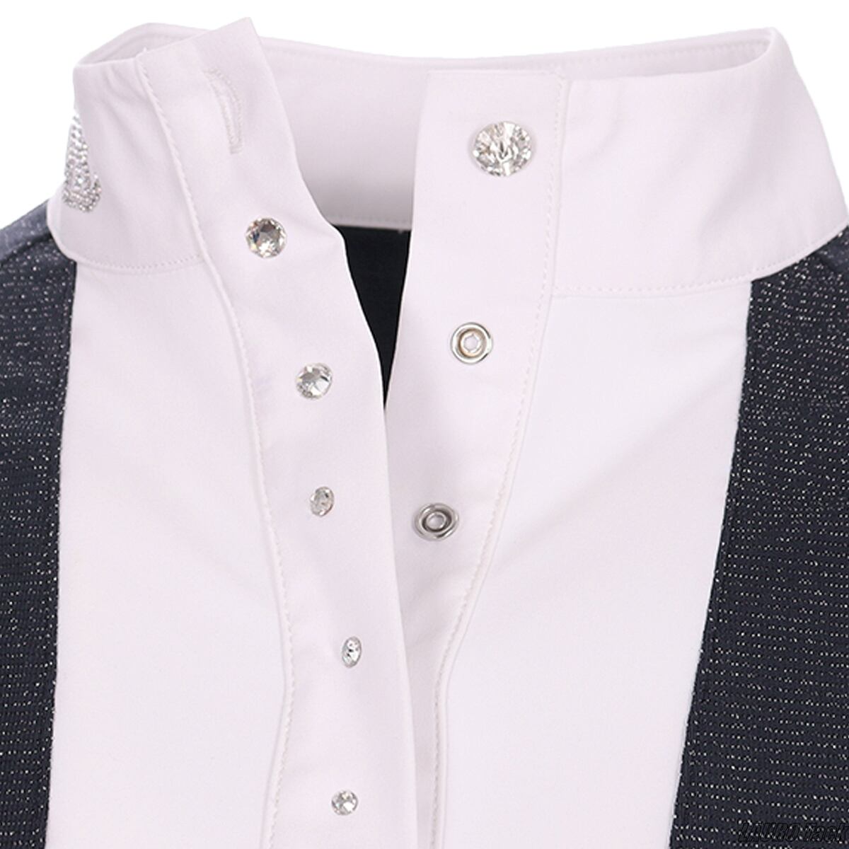 エレガントな冬のコレクションから登場したレディース競技用シャツです。伸縮性に優れた4方向ストレッチ素材を採用しまるで第二の肌のように体にフィットします。立ち襟のデザインには七つの隠しスナップボタンが配置され一番上のボタンだけが通常仕様になっています。襟にはきらめくラインストーンの装飾が施され首元を上品に演出します。短めの袖が軽やかな印象を与え競技会での装いを華やかに格上げする一枚です。