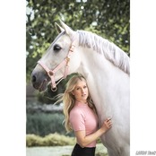 軽やかな印象の半袖トレーニングシャツです。4方向ストレッチ素材が動きに合わせて伸縮し快適な着心地を保ちます。首元には短い隠しファスナーとあご保護カバーを備え立ち襟部分にはブランドロゴのラインストーン装飾が輝きます。フラットな縫製で肌当たりがやさしくレッスンや日常のトレーニングに最適な一枚です。