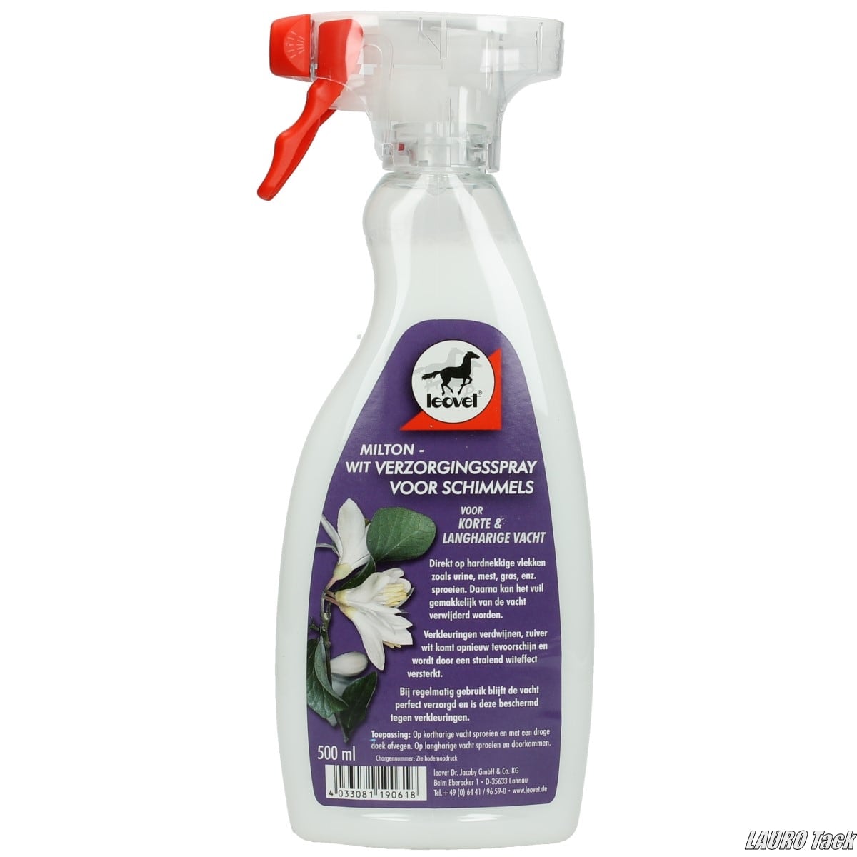 Spray Leovet Milton(Leovet) 白毛馬専用のケアスプレー。白い被毛の緑汚れや黄ばみを落とし、くすみを防いで明るい毛色を保ちます。天然タンパク質が被毛をコーティングし、汚れや色素の再付着を防止。繰り返し使用することで透明感と輝きが増し、白馬本来の美しさを引き立てます。ショー前や競技前の仕上げ、洗馬後のクリーンアップにも最適です。