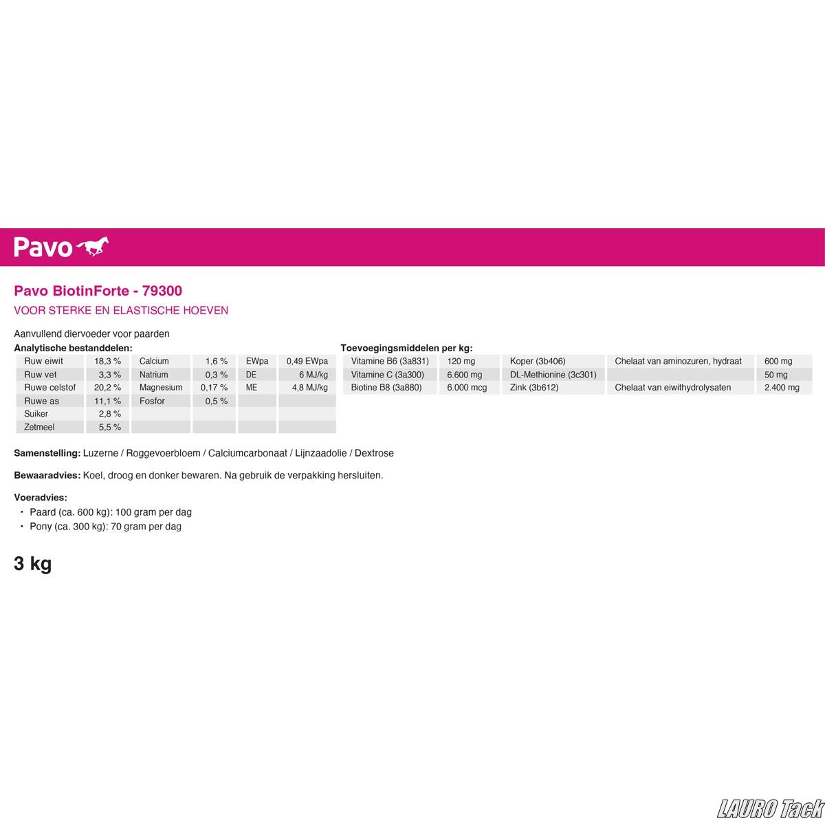 蹄の外側は角質でできており、人の爪と同じ素材です。健康な角質の成長は体の内側から始まります。もし蹄が割れやすい、欠けやすい、または角質の質が悪いといった問題がある場合は、Pavo Biotin Forteで蹄の成長をサポートしましょう。ビオチン(ビタミンB8)、銅、亜鉛、必須アミノ酸を配合し、最適な角質形成を支えます。強く弾力のある蹄づくりを助ける完全な蹄ケアサプリメントで、毛並みの健康にも役立ちます。研究により、これらの成分を適切に組み合わせることで単独のビオチン高用量よりも効果的であることが示されています。小麦不使用でグルテンに敏感な馬にも適しており、毛艶を改善して美しい見た目を保ちます。給与目安:馬(約600kg)100g/日、ポニー(約300kg)70g/日。【おすすめ】 蹄が割れやすい・もろい馬や毛並みを整えたい馬におすすめです。