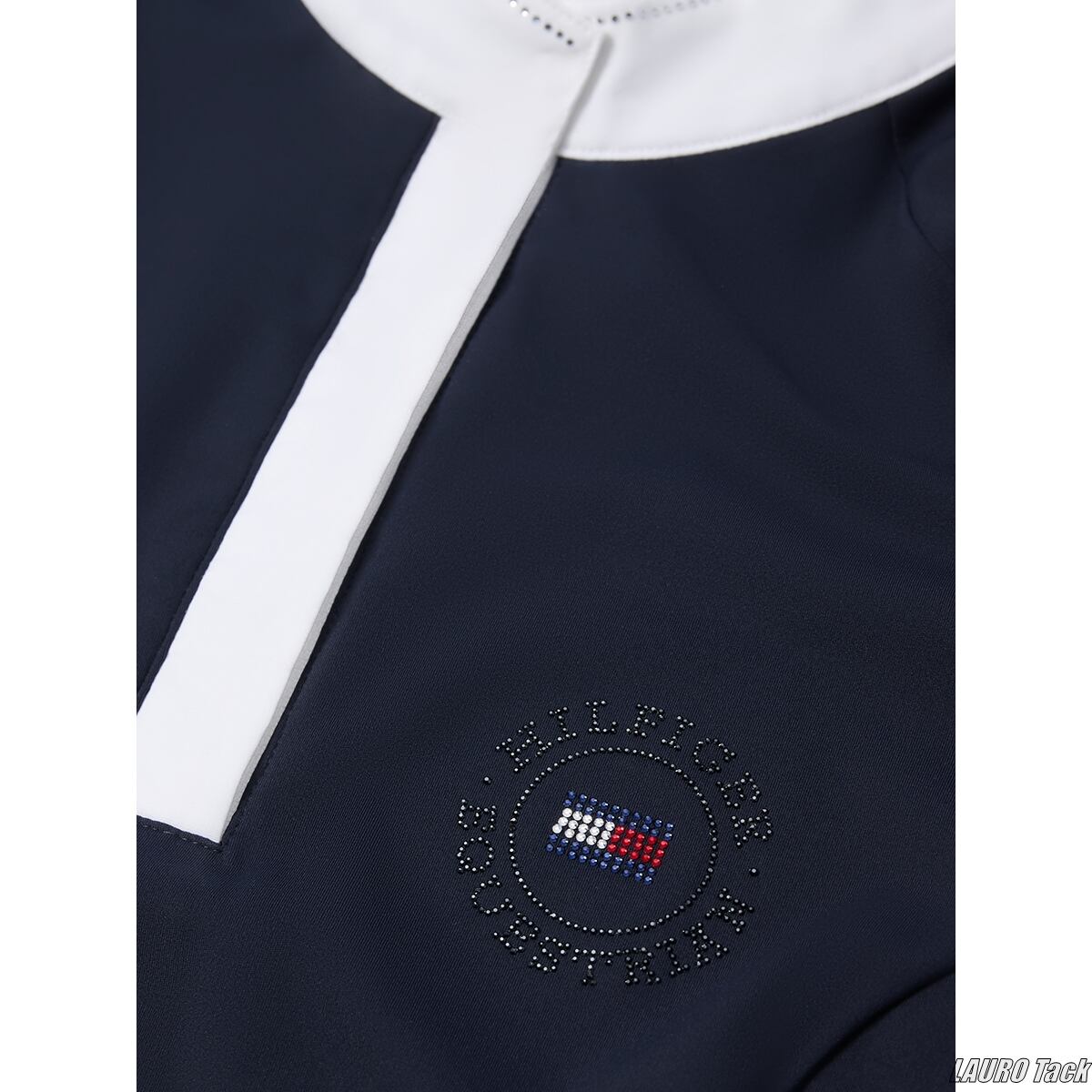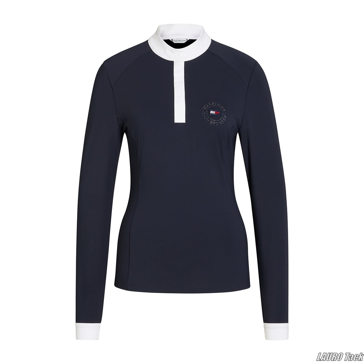 エレガントな女性用コンペティションシャツ。4方向ストレッチ素材で動きやすく、通気性・速乾性にも優れています。UVカット機能付きで快適な着心地。襟と袖口はホワイトでまとめられ、襟元にはラインストーンをあしらったスタンドカラーを採用。胸元にはトミーヒルフィガーのロゴストーンが輝きます。スナップ付きの隠しジッパー仕様で上品に仕上げられています。