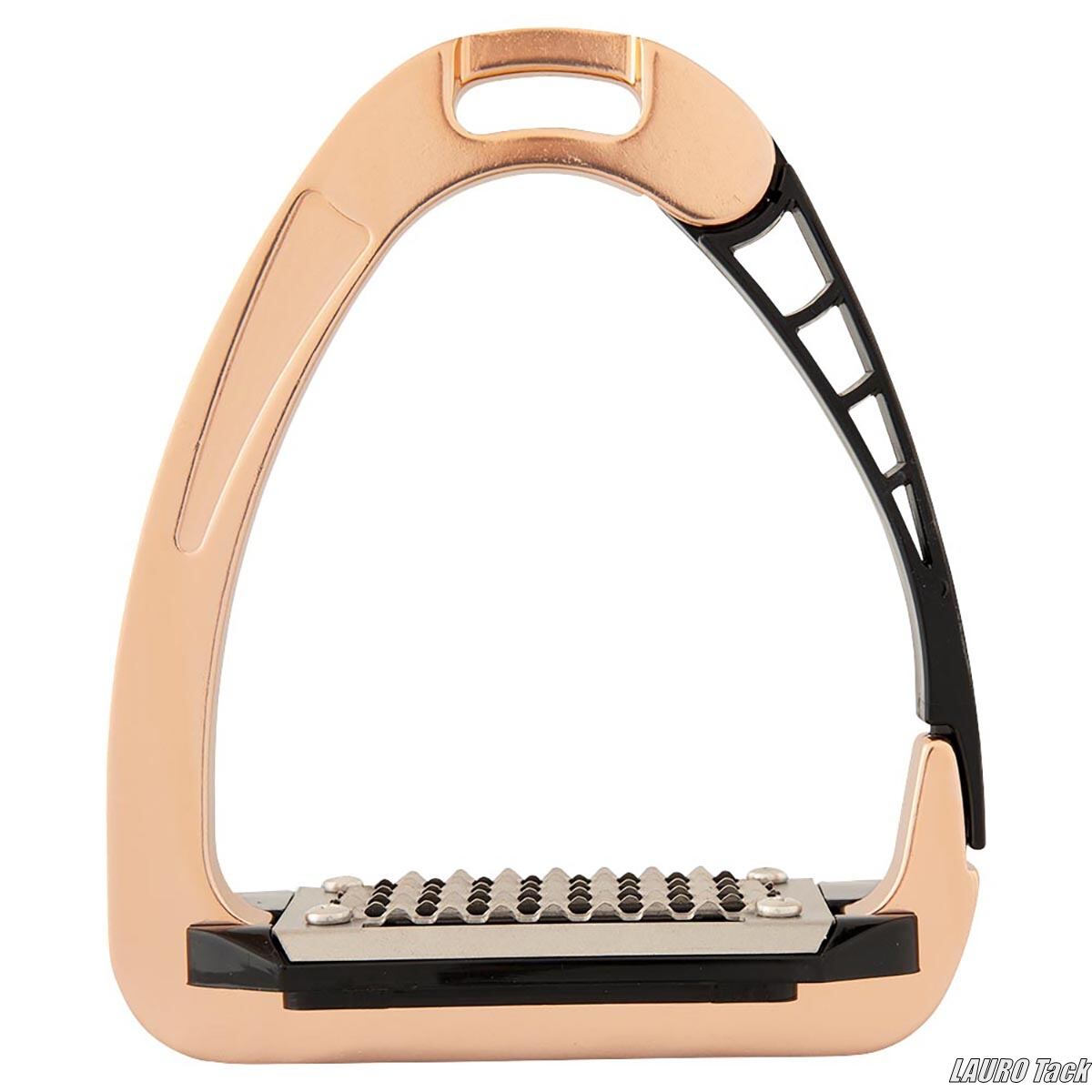 ジュニア向けアルミ製安全鐙。落馬時は外側が自動で開き、足が引っかかりにくい構造。抜けるとワンタッチで閉じます。滑り止め付き踏み面で安定性が高く、かかとを自然に下げる角度付き。左右セット。