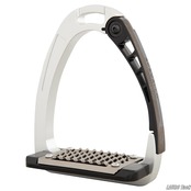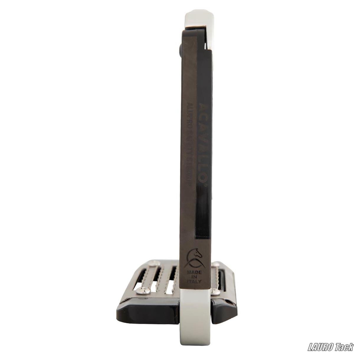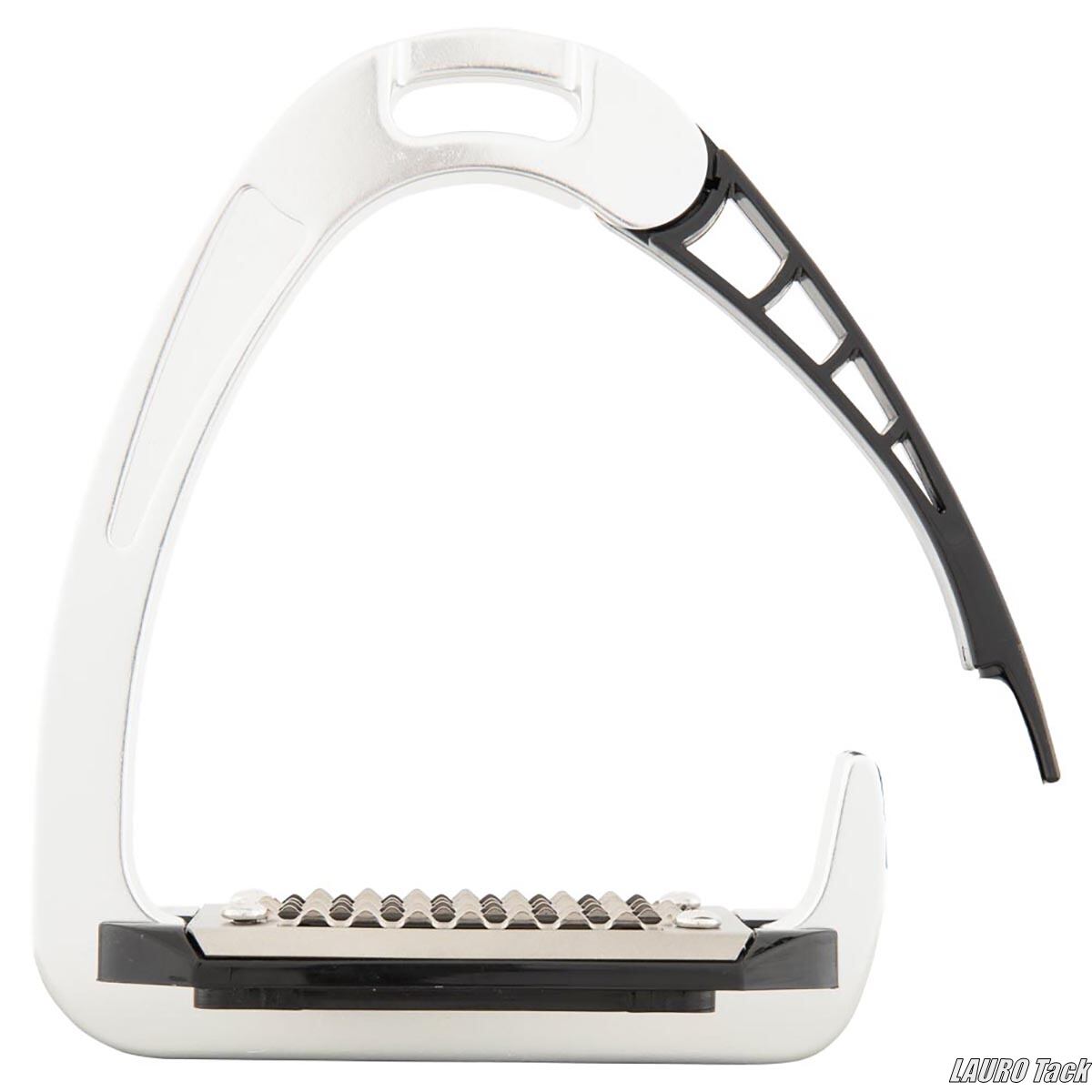 アルミ製のジュニア安全鐙。落馬時に外側が自動で開いて安全性を確保。足が抜けると自然に閉じる仕組み。滑り止め付きのステンレス踏み面は角度付きで、脚位置を安定させます。左右セット。