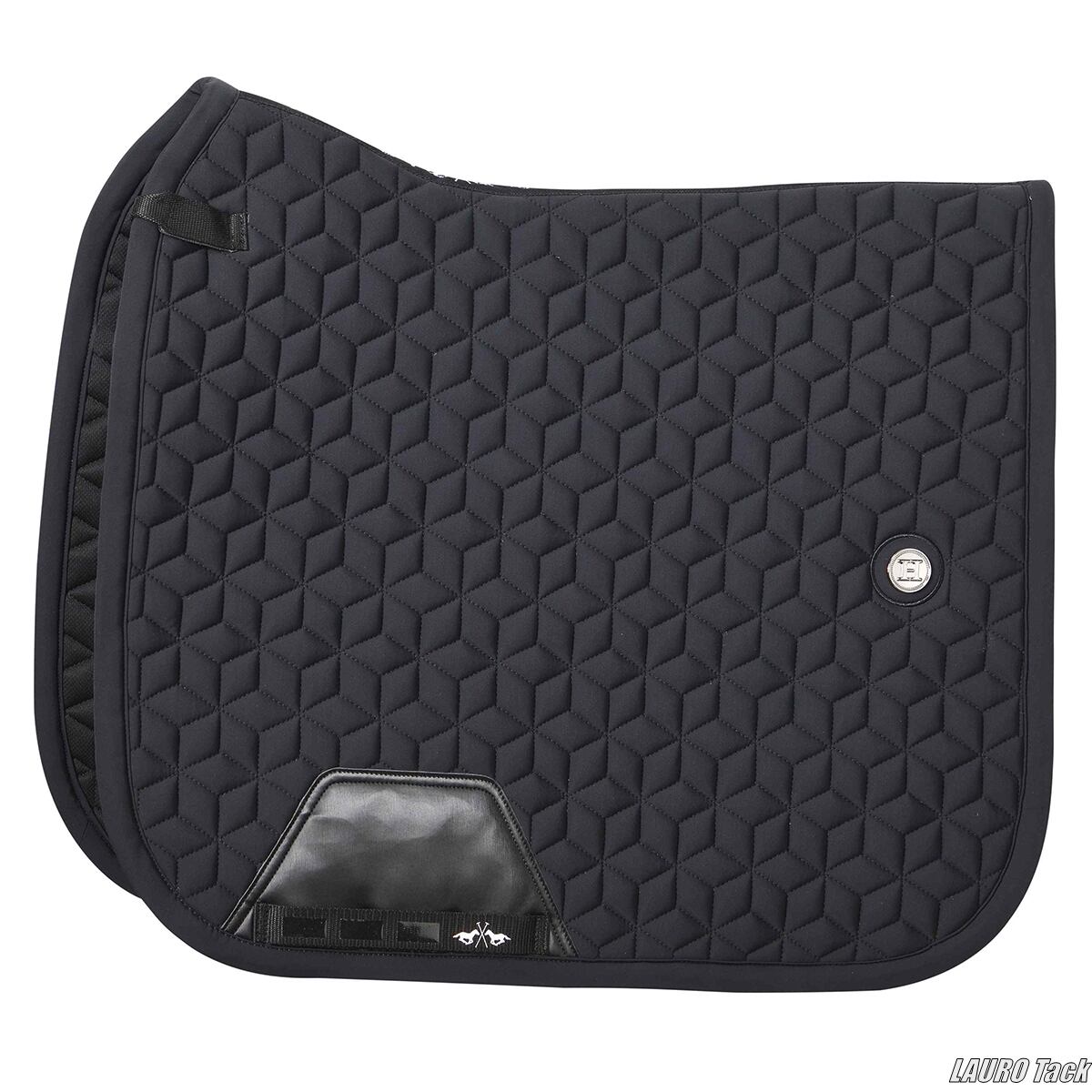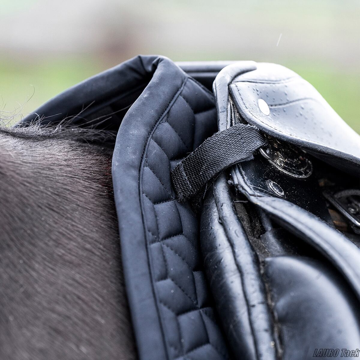 チェック柄のキルティングが印象的なドレッサージュ用ゼッケン。金属製のHV POLOバッジがアクセントになり、同系色の縁取りと控えめなラメのトリムが上品な雰囲気を演出。馬の背中に沿う立体構造でフィット感が高く、サドルループと腹帯ループで安定して装着できます。