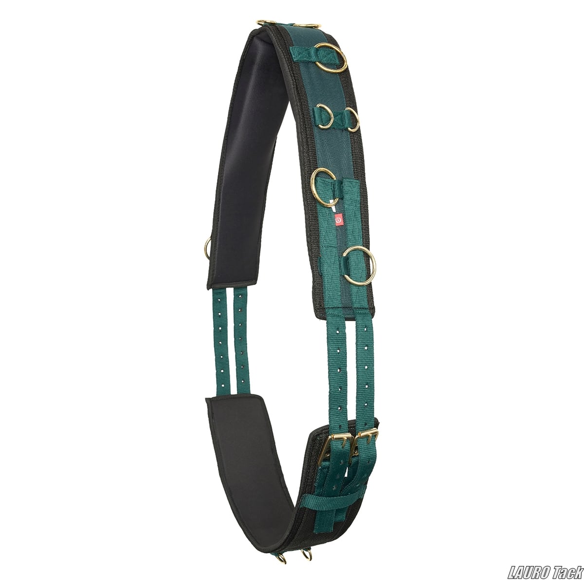 柔らかなナイロン素材にネオプレン(伸縮素材)裏地を合わせたロンジングベルト。圧力を均等に分散し、通気性・速乾性・滑りにくさを兼ね備えています。リングを多数備え、補助具の装着位置を自在に調整可能。ロールバックル付きで締めやすく、さまざまな馬体にフィットします。