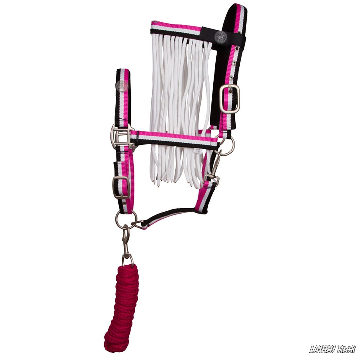 ポリエステル素材を使用した無口・引手・フリンジ(虫よけ用)の3点セット。柔らかい着け心地で、頭頂部と鼻帯部分の調整が可能。金具部分には高級感のあるメタリック仕上げを採用。放牧時やお手入れ時にぴったりな実用性の高いデザインです。