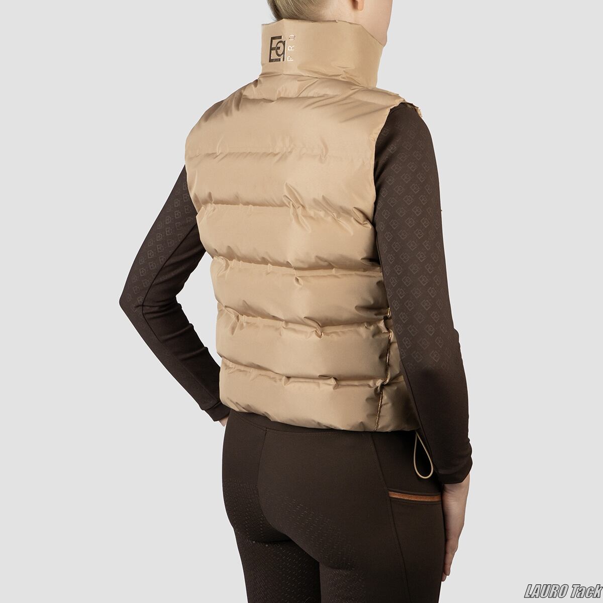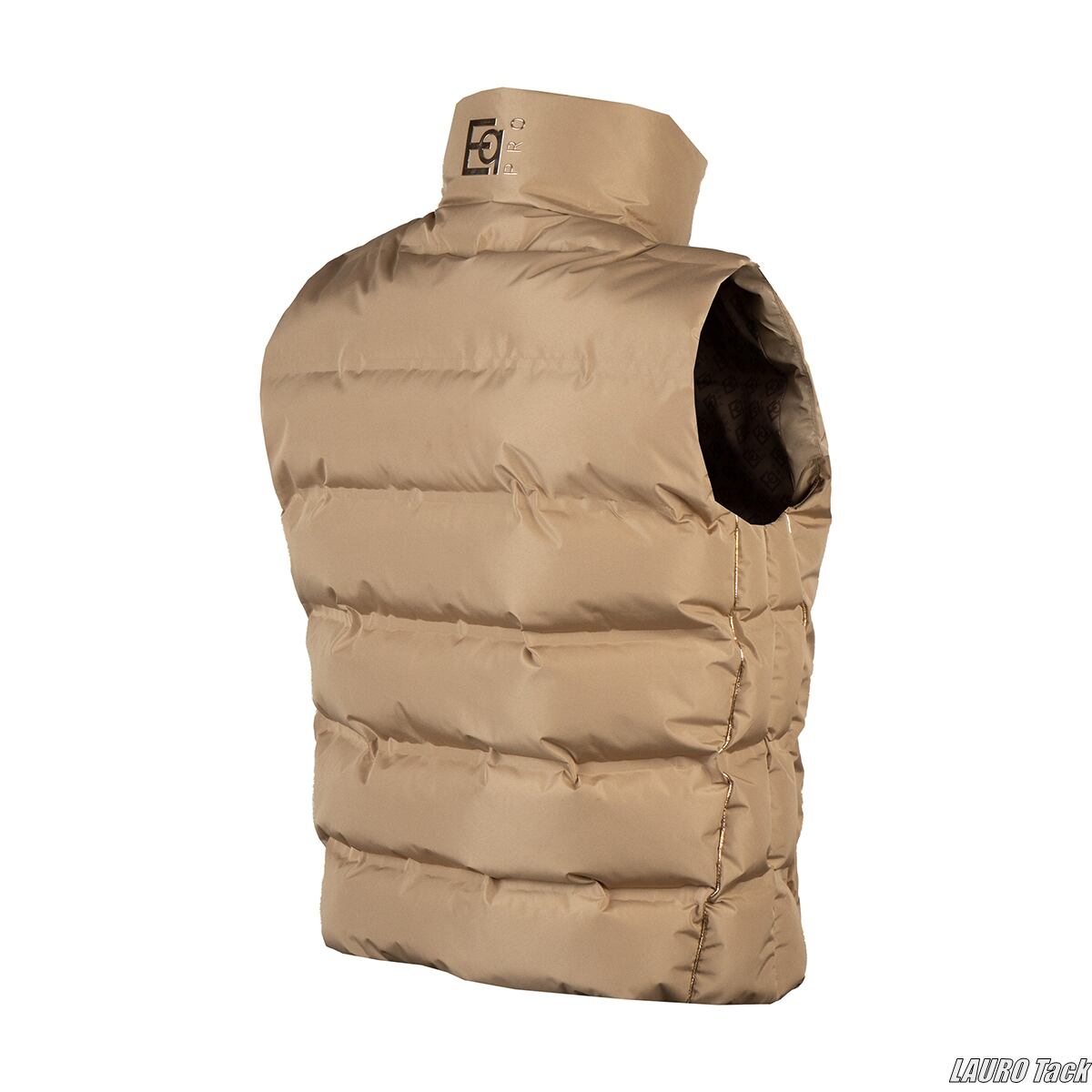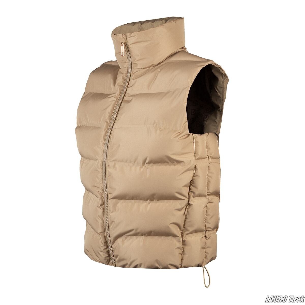 防水性のあるアウター素材にシーム加工を施した、上品で実用的なレディースボディウォーマー。高めのスタンドカラーが首元を暖かく保ち、広めのアームホールで動きやすさも抜群。裾はドローコードで調整でき、季節を問わず快適に着られます。