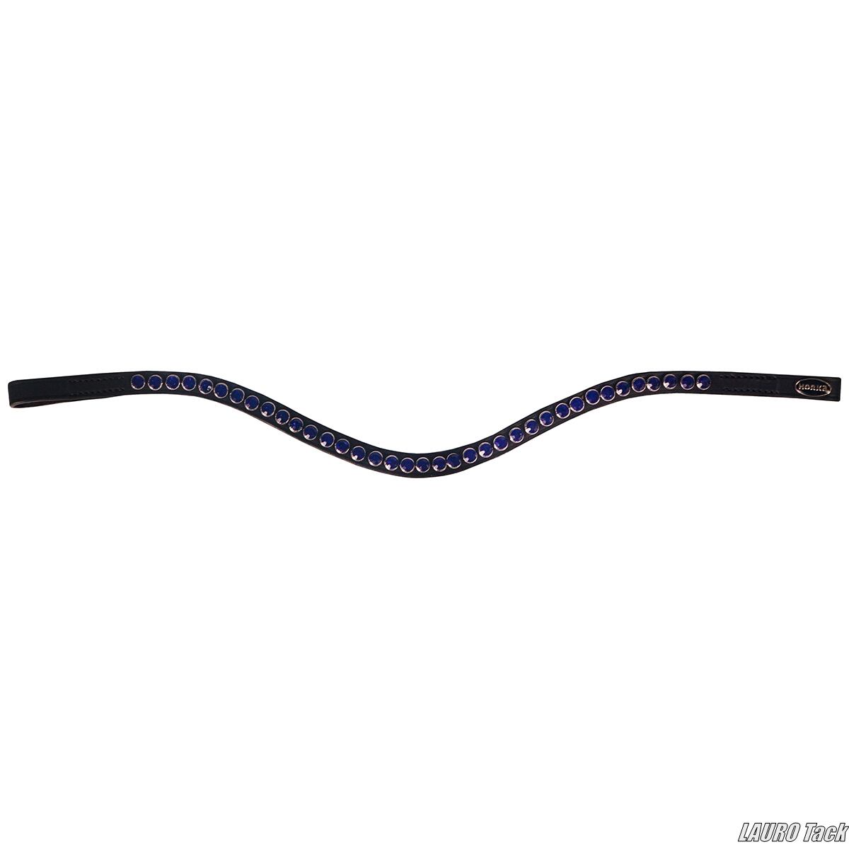 落ち着いたブラウンにライトブルーのストーンが映える額革。カーブデザインで上品な印象を与え、馬場馬術から日常使いまで幅広く活躍。