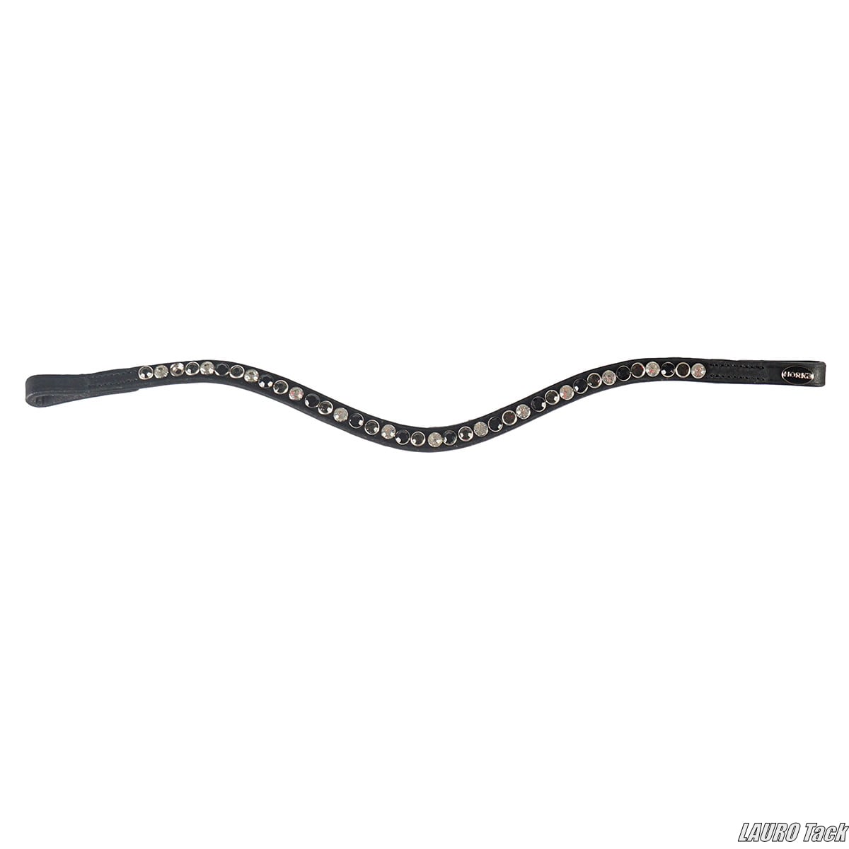 ブラックレザーに同系色のストーンを配した、シンプルで洗練された額革。控えめな輝きが上質さを引き立て、どんな頭絡にも合わせやすいデザイン。