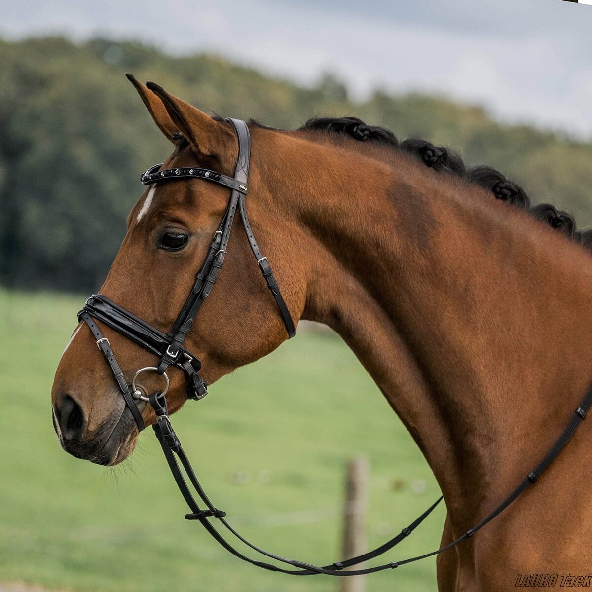 高級感のある頭絡。鼻革と頭頂部分には羊毛ボアの柔らかなパッド入りで、愛馬の肌への当たりをやさしくサポート。エナメル加工の鼻革にはカラーパッドが施され、華やかな印象に仕上がっています。額革にはストーンやパールの装飾を施し、気品あるデザイン。ウェブ手綱(滑り止め付き)付きで、機能性と美しさを両立したモデルです。
