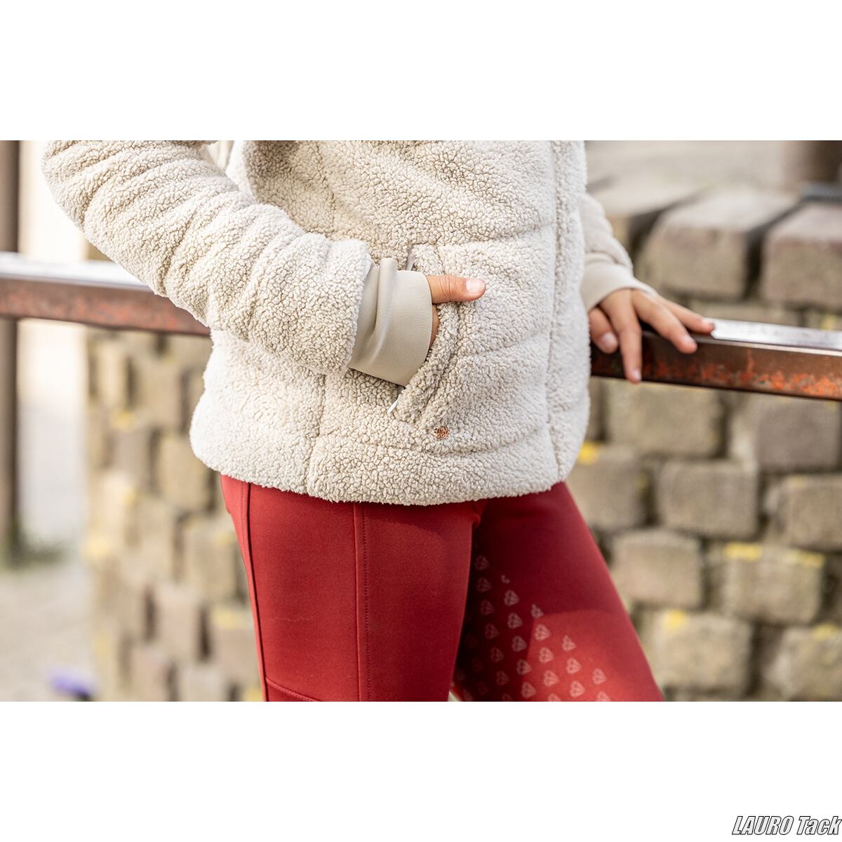 暖かく柔らかな着心地のキッズ用ジャケット。横ステッチのすっきりしたデザインに、スムース裏地、スタンドカラー、隠しジップポケット2つ、サムホール付き袖口など、冬の厩務や騎乗にぴったりの仕様。ローズゴールドのディテールが上品さをプラス。