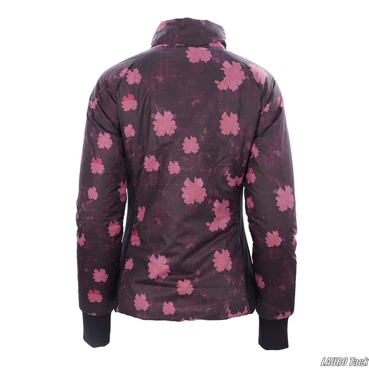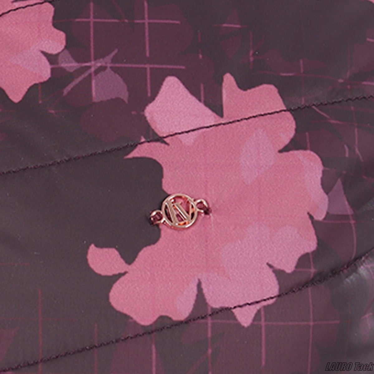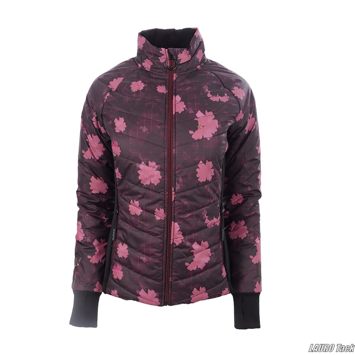 リーフ&フラワー柄の総柄プリントが魅力のスポーティーなレディースジャケット。柔らかい裏地と薄めのポリエステル中綿で軽く暖かく、スタンドカラー、チンガード付きファスナー、内側ウインドフラップ、2つのジップポケット、サムホール付き伸縮カフを備え、ローズゴールドの装飾が華やかさを添えます。