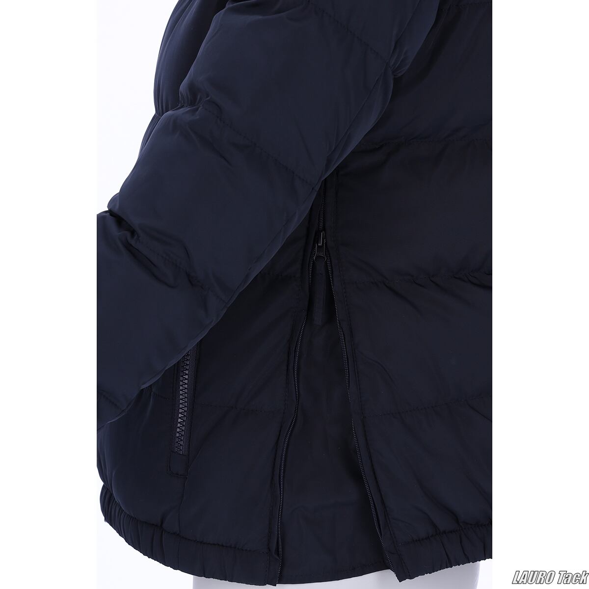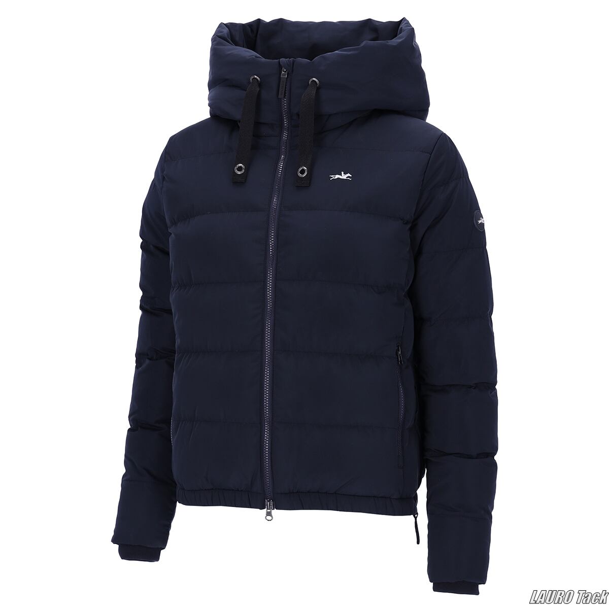 水を弾く表地のレディース向けウィンターコート。大きめのフード、ストームカフ、2WAYファスナーなど寒い日のレッスンに役立つ仕様。内外に複数のポケットを備え、胸や袖のロゴデザインが上品な印象です。