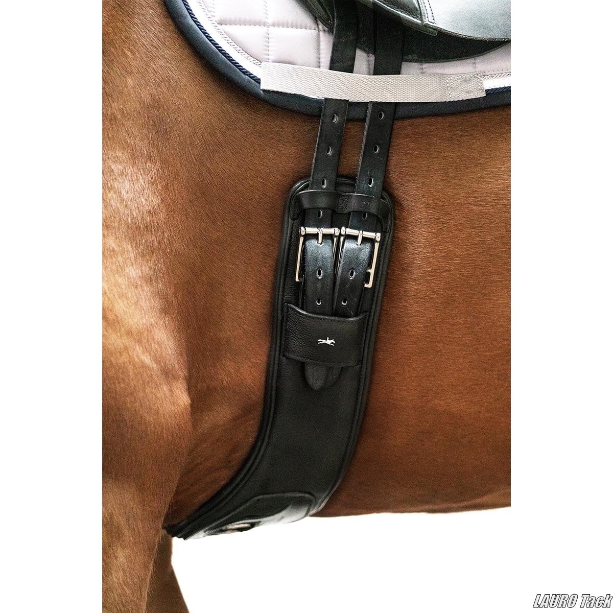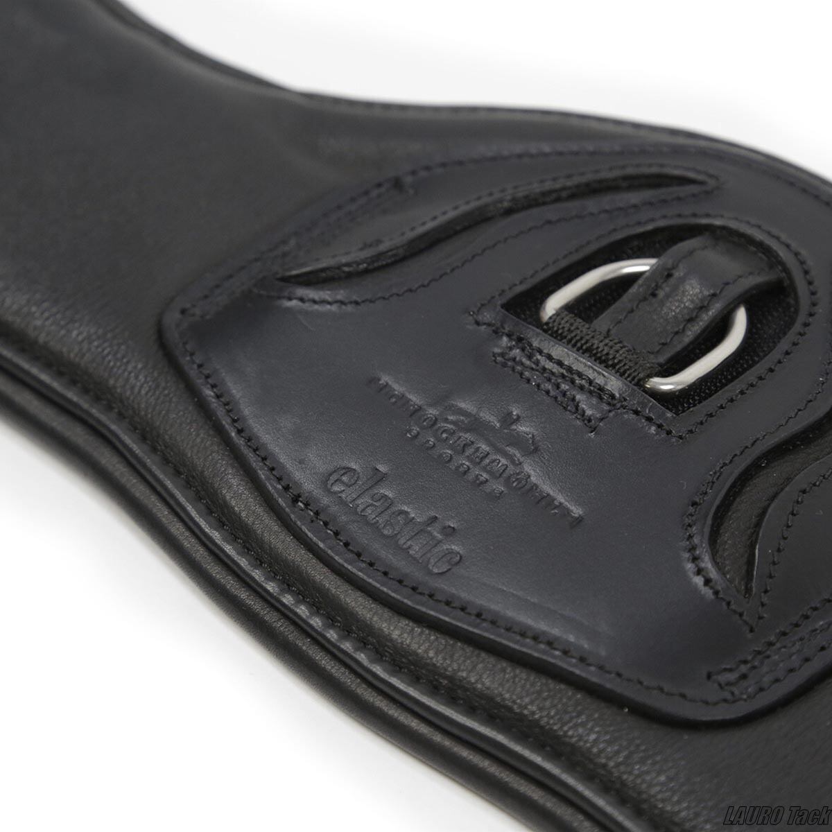 中央部分が広く作られた馬場用腹帯で、お腹への圧力が均等にかかるように設計されています。柔らかい本革を使用し、両側に伸縮部分を設けて馬の呼吸や動きを妨げにくい構造です。中央には補助具を取り付けられるDリングがあり、トレーニングの幅が広がる便利な仕様です。