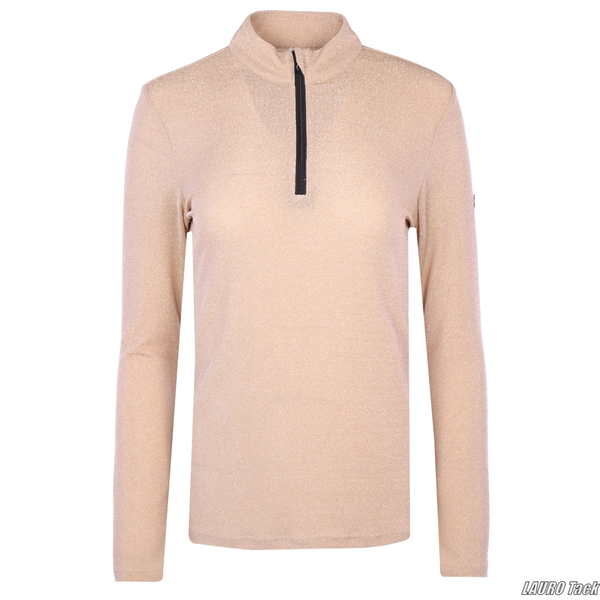 光沢のあるルレックス素材を用いたロングスリーブのトレーニングシャツ。上品で華やかな印象があり、高品質で着心地の良い仕上がり。4方向に伸びるストレッチ生地がスムーズな動きをサポートし、日々のトレーニングにも特別な日の騎乗にもぴったりです。