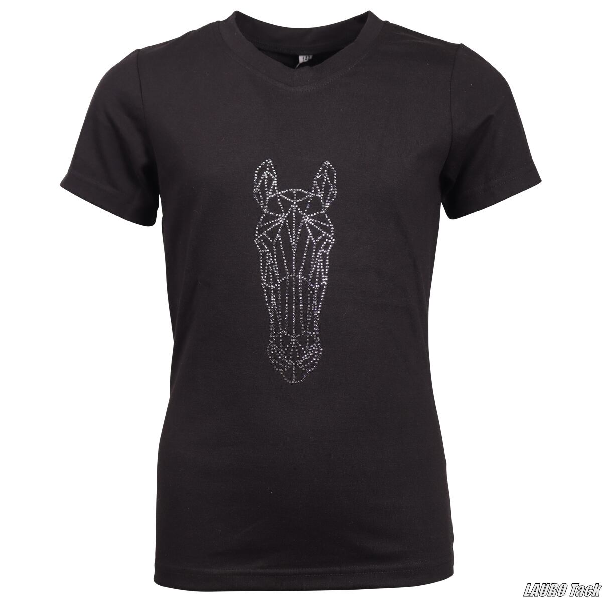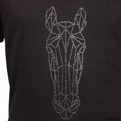 綿×ポリエステルの柔らかな素材を使ったキッズTシャツ。短袖・ラウンドネックのベーシックな形で着やすく、胸元にはラインストーンで描かれた美しい馬のヘッドデザインを配置。日常にも厩舎にも合わせやすい上品な仕上がりです。
