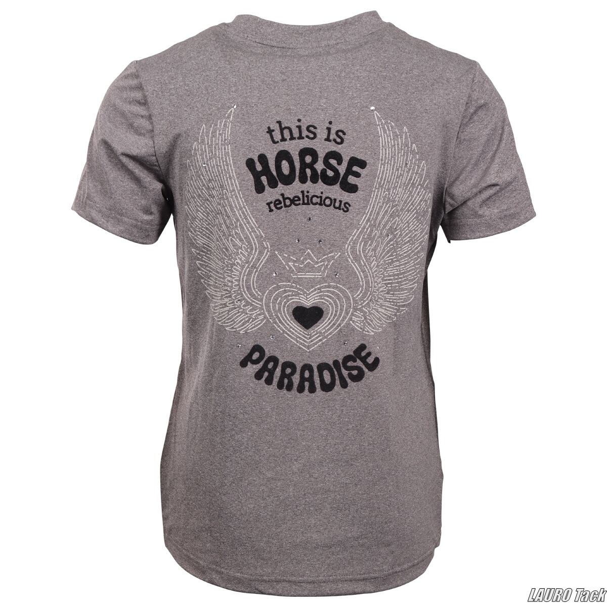 背面に「this is HORSE rebelicious PARADISE」の文字と、シリコンとラインストーンで形作られた翼のデザインが映えるキッズTシャツ。伸縮性のある素材で動きやすく、ラウンドネックと半袖で普段使いしやすい一枚。背面の装飾は複数素材を組み合わせた立体的な仕上がりで、個性を引き立てます。素材はマイクロポリエステル93%・エラスタン(伸縮性のある素材)7%。