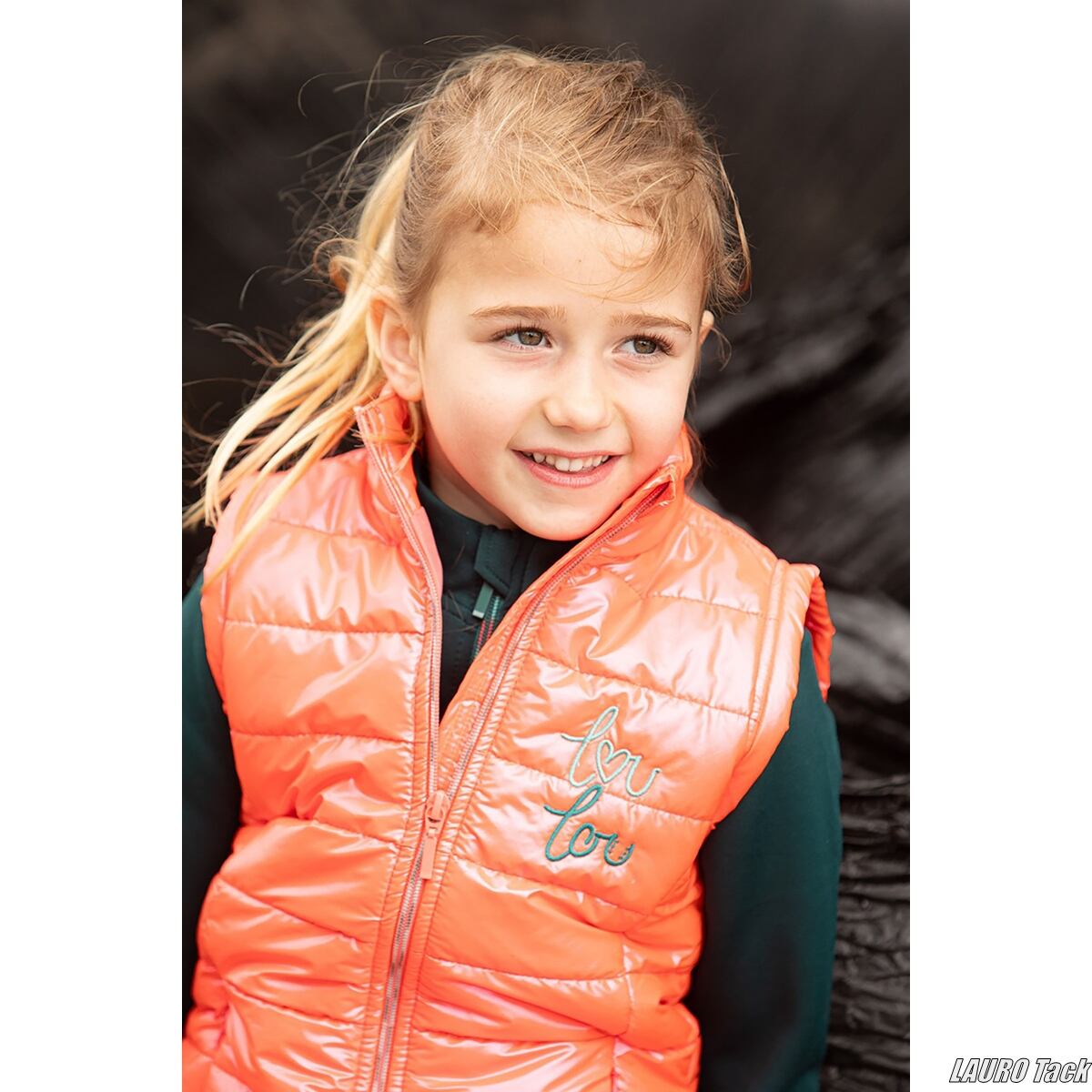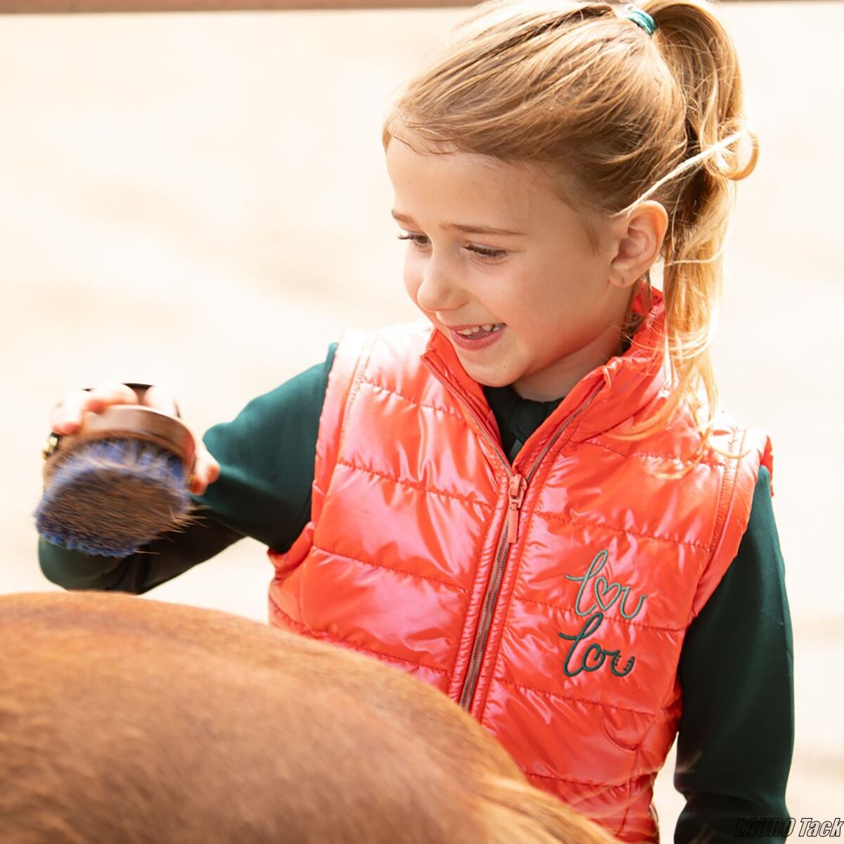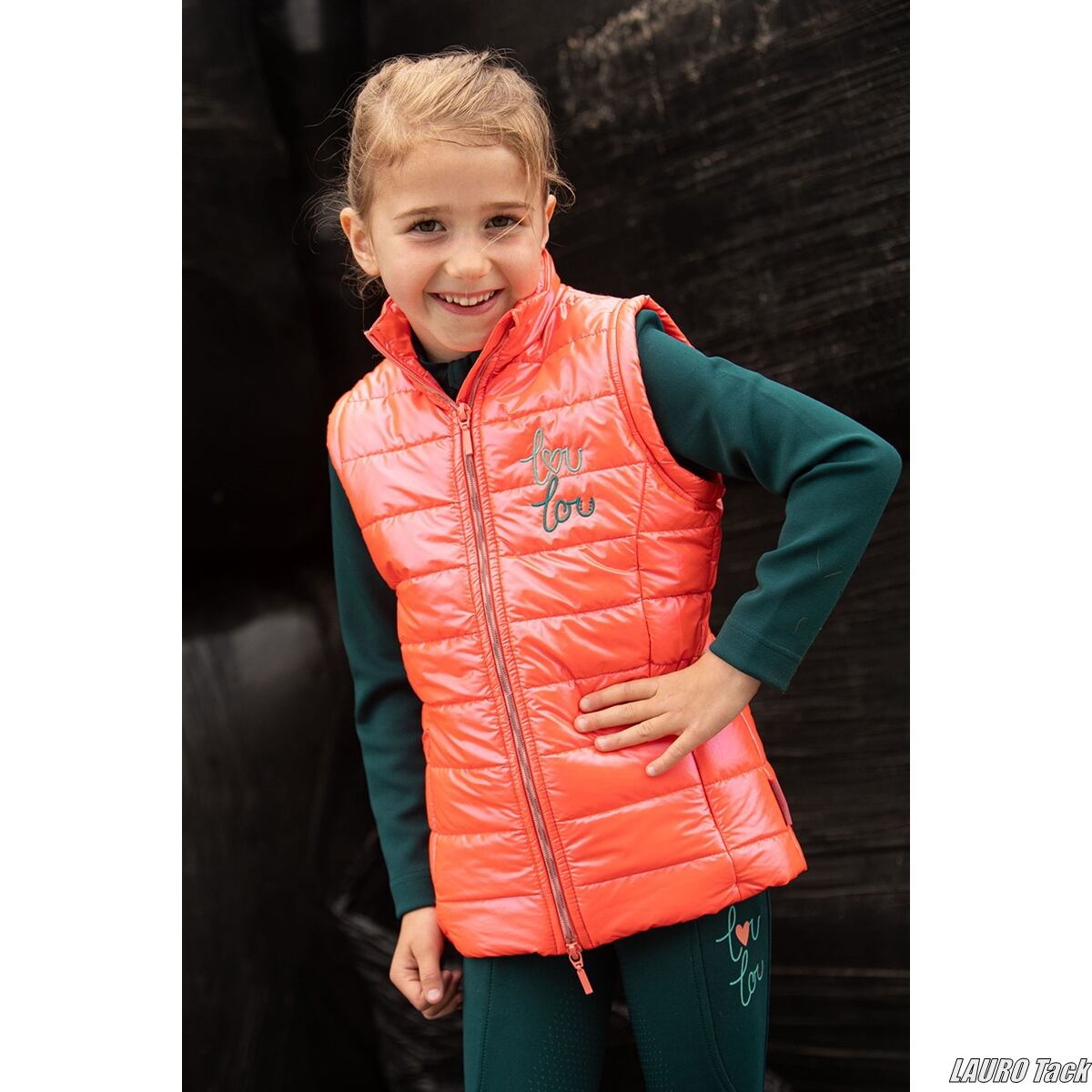 LouLouコレクションらしいスタイリッシュなデザインのキッズ用ボディウォーマーで、2-wayファスナーと隠しジップポケット2つを備え、実用性も抜群です。スタンドカラーにはチンガードが付いており、ファスナーによる肌当たりも防止。胸元にはLouLouのロゴが美しく配置され、洗練された印象に。軽くて動きやすい設計で、外でも厩舎でも活躍する万能アウターです。