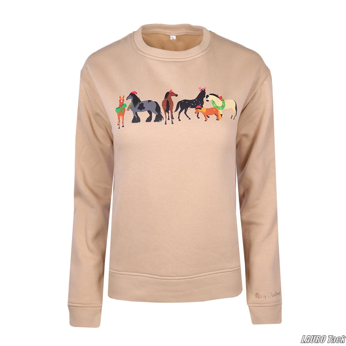 Epplejeckのキッズ向けクリスマスセーターで、柔らかくあたたかい素材を使った丸首・長袖の定番デザインです。フロントには明るい雰囲気のホースモチーフのクリスマスプリントが大きく描かれ、左袖にはやさしい輝きを添える“Merry Christmas”の文字がデザインされており、冬の可愛い装いにぴったりの一枚に仕上がっています。