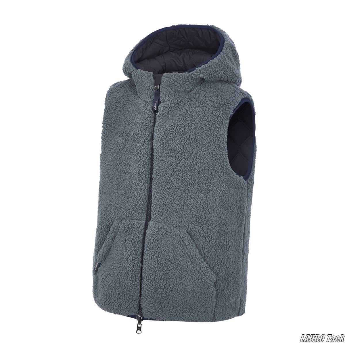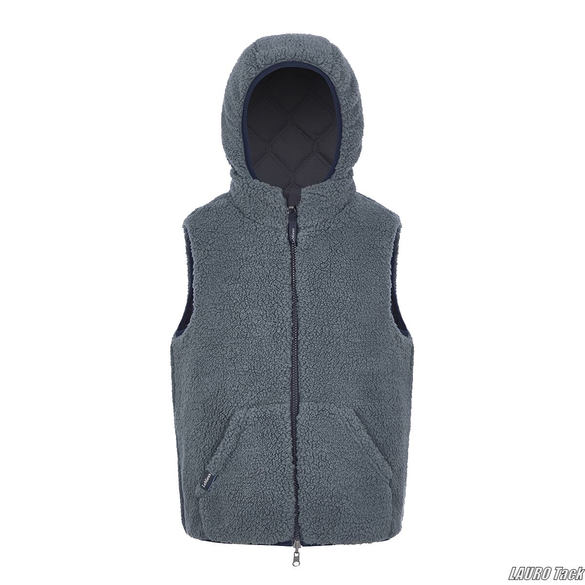 落ち着いたダークブルーが上品な、キッズ向けのあったかベストです。片面は水をはじきやすい生地、もう片面は全面フリースでその日の気温に合わせて着方を選べます。手を温めやすいポケット、上下どちらからも開けられるファスナー、ファスナー上部のあご当たりを防ぐカバー、取り外しできるフードなど使いやすい機能がそろっています。