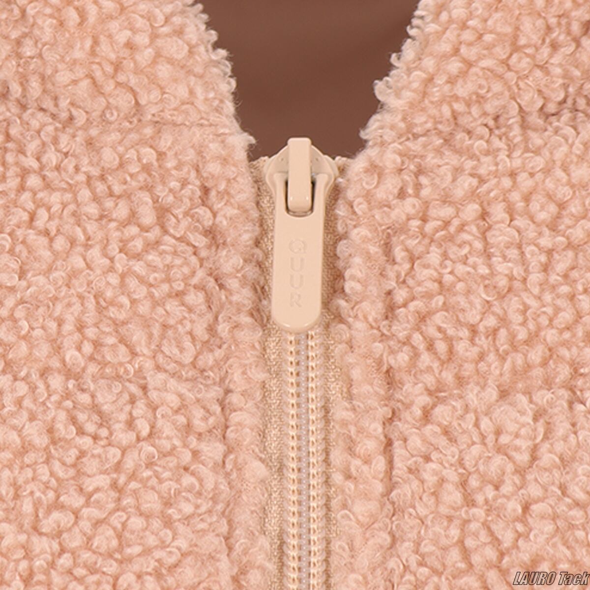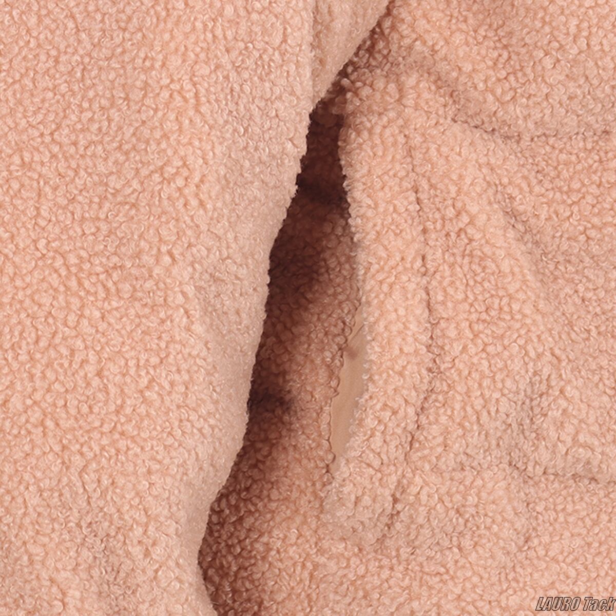 淡いベージュが可愛らしいキッズ用テディジャケットです。外側はふんわり柔らかく、内側はなめらかな裏地で着脱がスムーズ。フード付きで防寒性が高く、両サイドにはスナップ付きポケットを備えています。胸元のワンポイントがさりげないアクセントになり、レッスン前の防寒や普段使いに重宝します。生地にはポリエステルが使われています。