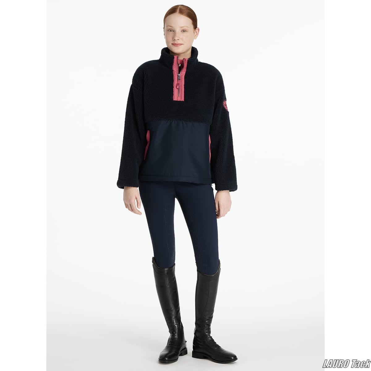 深いダークブルーが上品な印象のキッズ用スウェットです。外側はもこもこした柔らかなフリースで暖かく、切り替え部分やファスナーの配色が程よいアクセントになっています。立ち襟が首元をしっかりカバーし、左右には便利なファスナーポケット付き。袖にはロゴのワンポイントが入り、カジュアルにもレッスンの行き帰りにも使いやすい一着です。生地にはポリエステルが使われています。