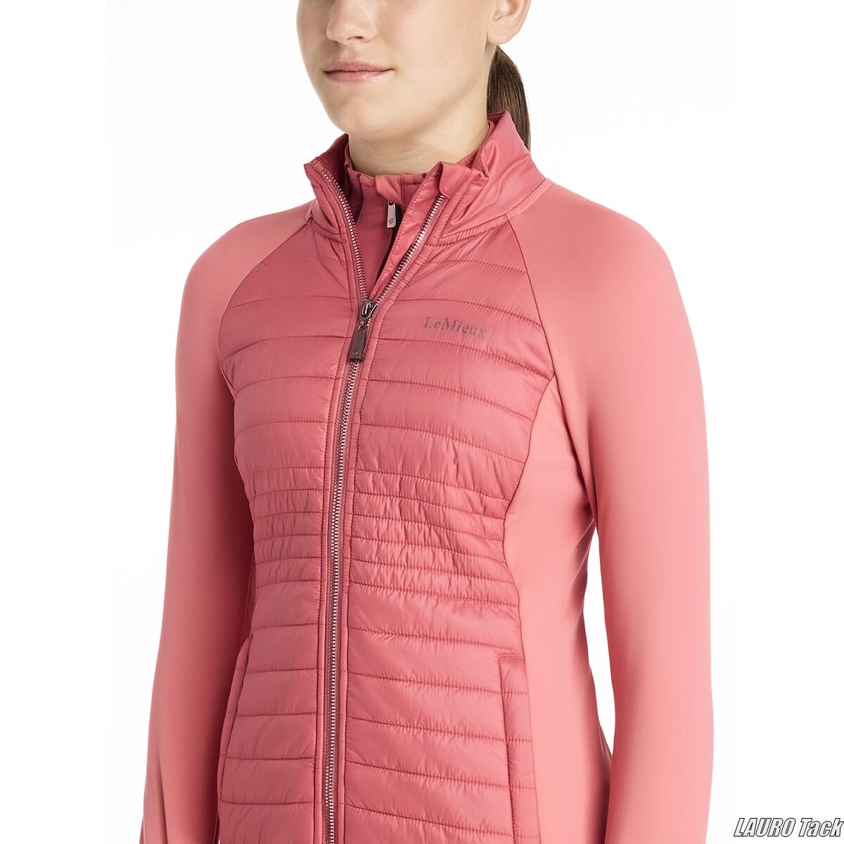 鮮やかなダークピンクが華やかな印象のキッズ用軽量ジャケットです。前後の部分にはリサイクル素材の中綿が入り、体をふんわりと暖かく包み込みます。袖とサイドには動きやすい柔らかな生地を使っており、レッスン時もストレスなく動けるデザイン。胸元のロゴや袖のメタルバッジが上品なアクセントとなり、ミドルレイヤーとしても単体のアウターとしても使いやすい一着です。生地にはポリエステルと柔らかなジャージー素材が使われています。