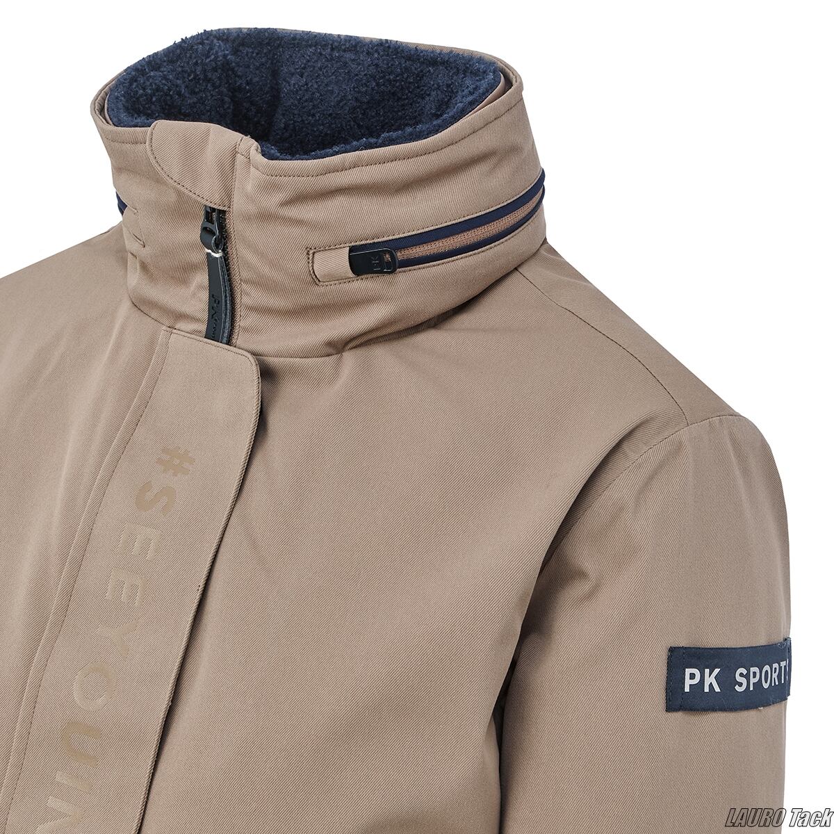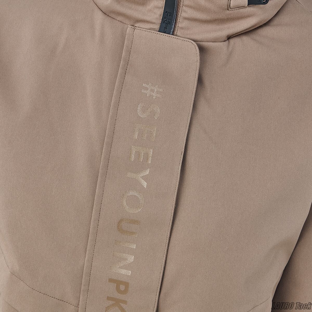 柔らかなライトブラウンがナチュラルな雰囲気のキッズ用ウィンタージャケットです。風や雨をしっかり防ぐ素材を使用しており、冬のレッスンや外乗でも安心。首元には手触りの良いふわふわのフリースをあしらい、スタンドカラーの内部には必要な時に使えるフードを収納。スナップ付きの風よけフラップや、さりげなく配置されたフロントポケット、裾のリブ仕様など機能性の高いつくりです。襟周りの配色ラインがスポーティなアクセントを添え、軽さと暖かさを両立した一着です。生地にはポリエステルとナイロン系素材(ポリアミド)が使われています。