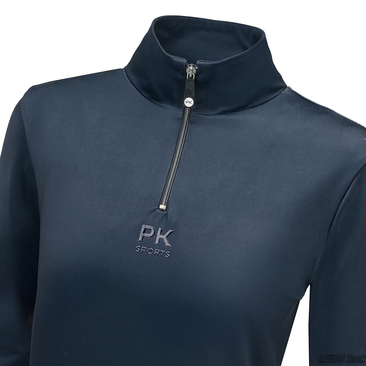 深いダークブルーがスタイリッシュな印象のキッズ用トレーニングシャツです。乾きが早く、汗をかいてもムレにくい高機能素材で作られており、UV対策にも優れています。スタンドカラーの首元には短いファスナーがあり、温度調整がしやすい仕上がり。背面にはコントラストカラーの縦ラインが入り、袖にはブランドのスポーティなプリントがあしらわれています。レッスンから日常のスポーツまで幅広く使える一着です。生地にはポリエステルとナイロン系素材(ポリアミド)が使われています。