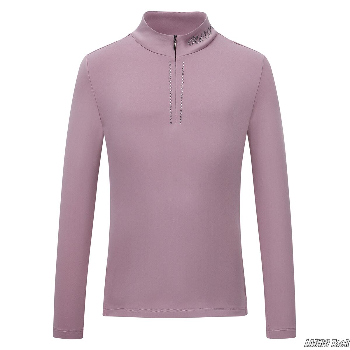 淡いライトパープルが可愛い印象のキッズ用トレーニングシャツです。全方向にしなやかに伸びるストレッチ生地で動きやすく、内側は起毛フリースのような柔らかな裏地で寒い日もあたたかく快適に過ごせます。首元は短いファスナー付きのスタンドカラーで温度調節がしやすく、ファスナーまわりのラインストーン飾りと襟元のロゴが上品なアクセントになっています。レッスンにも普段のお出かけにも使いやすい一枚です。