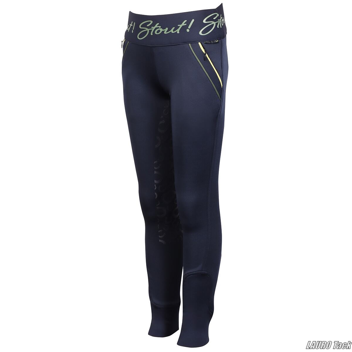 深いダークブルーに差し色が映えるキッズ用ライディングタイツです。シリコンフルグリップの蹄鉄デザインが鞍上での安定感を高め、幅広ウエストでフィット感も快適。脚口はブーツの中でもごわつきにくい伸縮仕様で、斜めファスナーポケットやSTOUT!のロゴテープが遊び心のあるアクセントになっています。