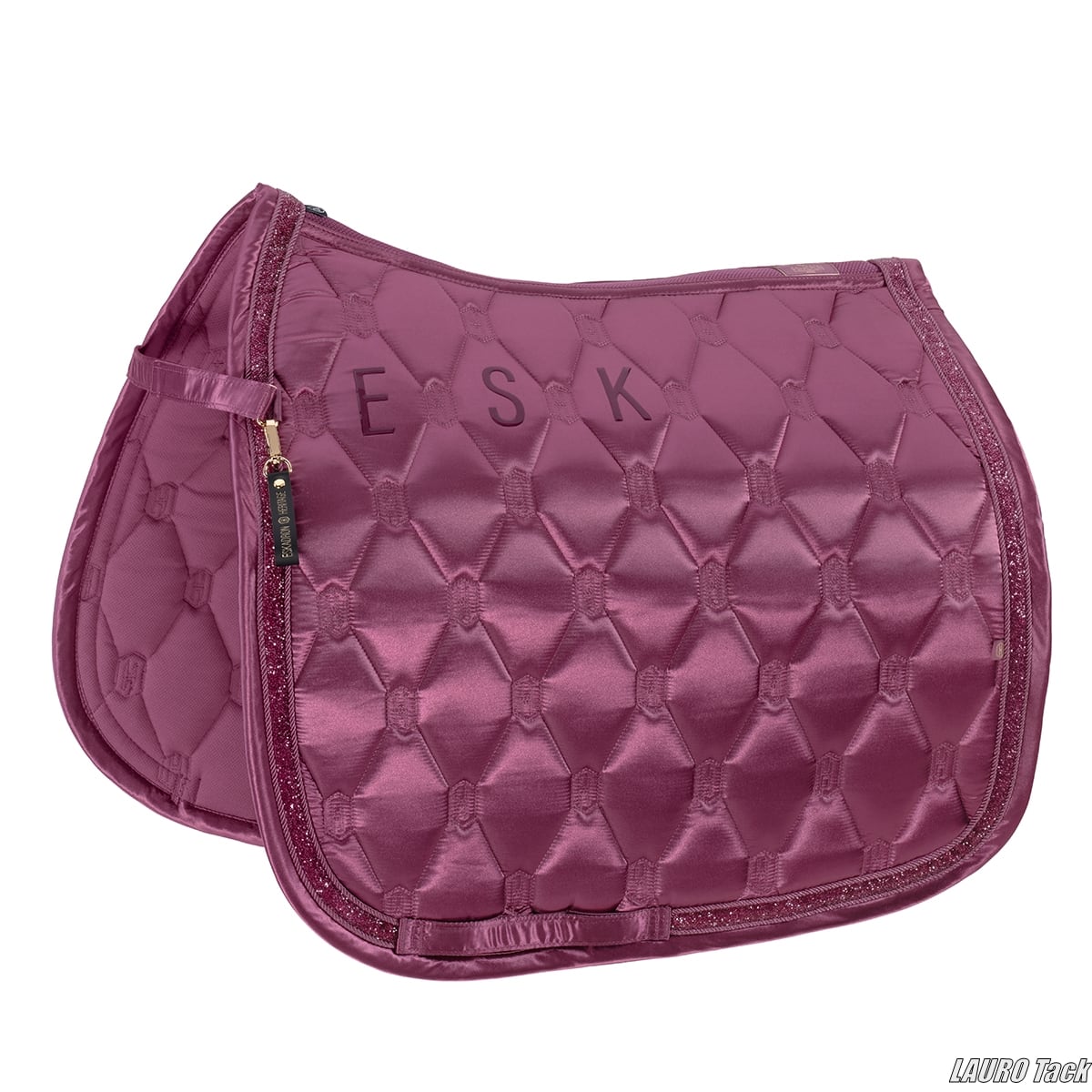 ヘリテージシリーズ“Jewel”ラインのサテン馬場馬術用ゼッケン(ピンク)。淡いサテンのつやに、さりげないストーン飾りが上品なポイントとなる華やかなモデルです。柔らかい裏地が汗を吸い取り、背中を快適に保ちながら明るいピンクで可愛らしい印象にまとめてくれます。