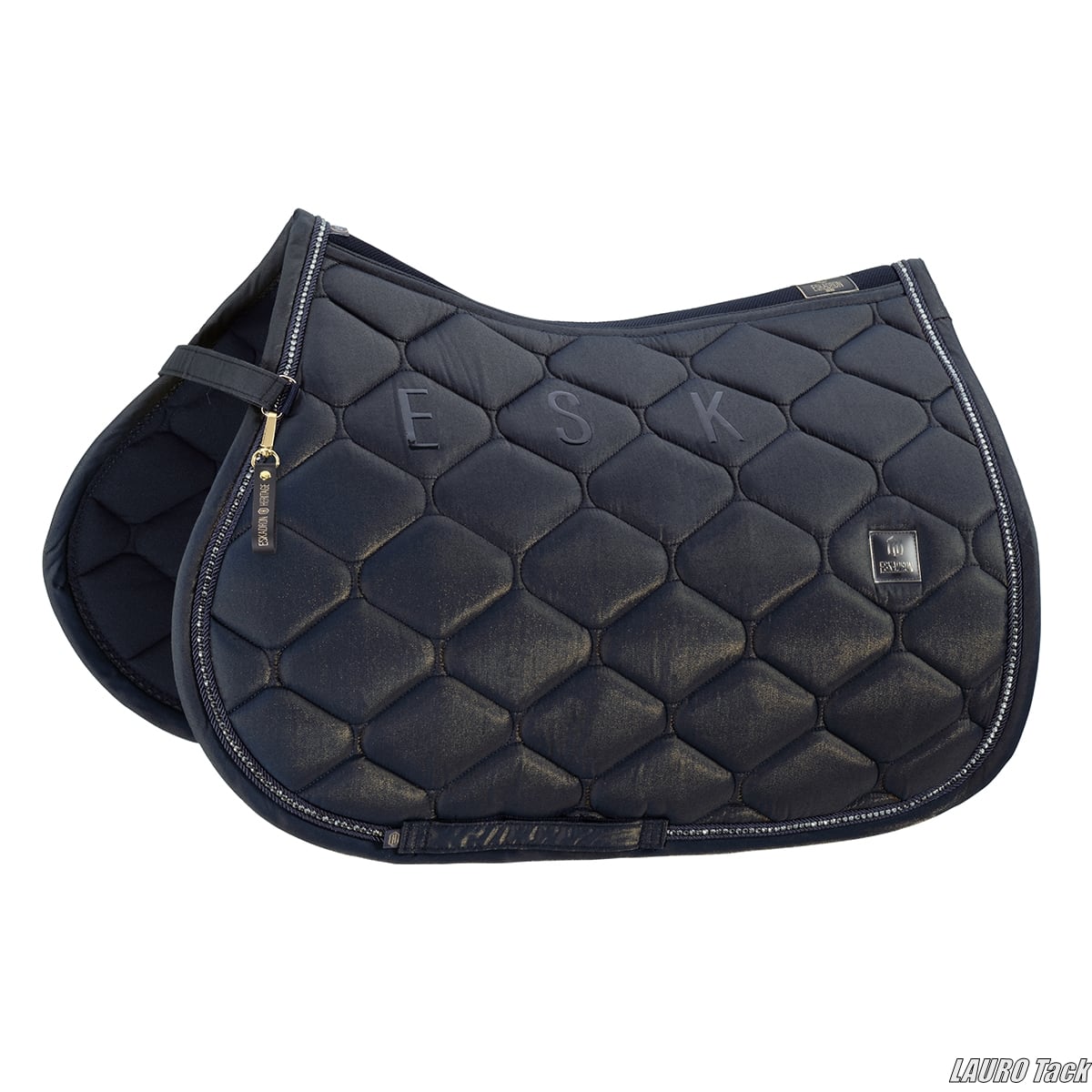 ヘリテージGlam Crystalゼッケン(ダークブルー)。深いネイビーの表面に控えめなクリスタルが優しく輝き、落ち着いた雰囲気と上品さを両立したデザイン。背中側は柔らかな素材で負担を軽減し、馬場鞍・障害鞍どちらにも合わせやすく、馬体色を問わず取り入れやすい万能なゼッケンです。
