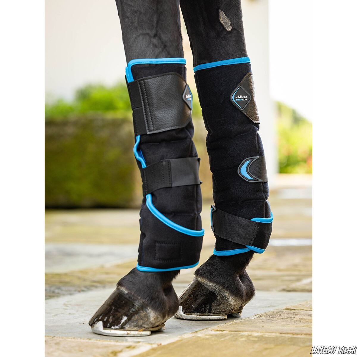前肢・後肢どちらにも使える冷却ブーツで、冷凍ジェルが脚にしっかり沿って安全にクーリングできます。高さのある形が球節まで包むようにフィットし、3本の伸縮バンドで簡単に装着可能。運動後の腱ケアや熱がこもりやすい季節のケアにとても頼れるアイテムです。