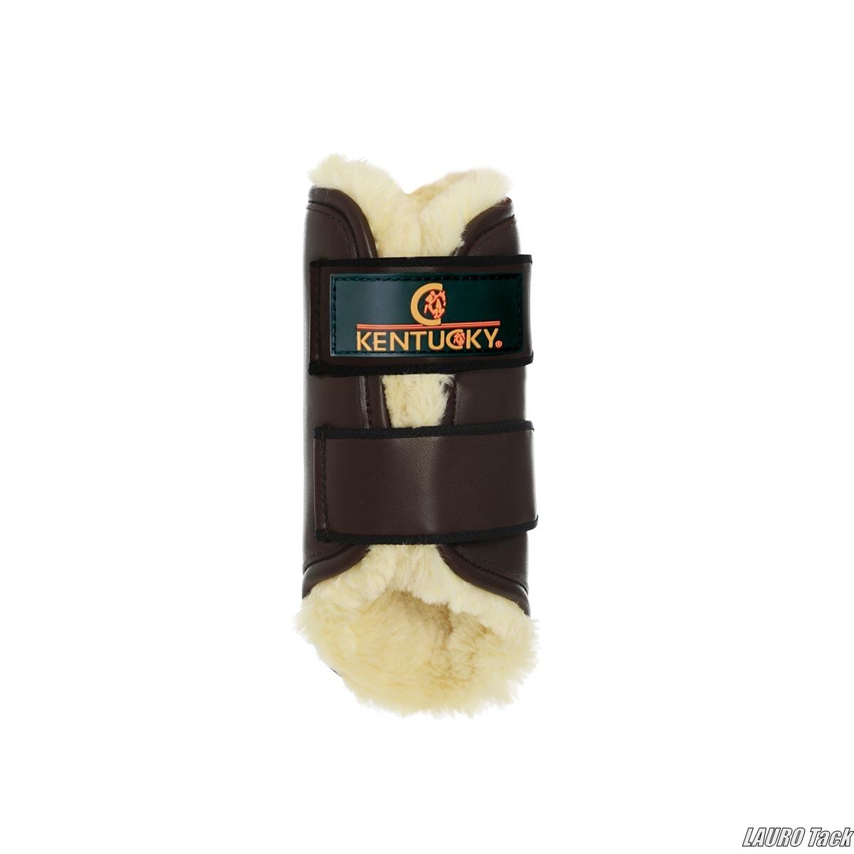 ケンタッキーの前肢用ブラッシングブーツは、防水性の高いアーティフィシャルレザー(合成レザー)を外装に採用し、湿気や汚れを吸収しないため非常に耐久性があります。内側はアーティフィシャルウール(人工ウール)で肌あたりが柔らかく、敏感肌の馬にも安心です。日常のトレーニングに適し、強力な面ファスナーで装着できます。30℃で洗濯可能で、乾燥機不可の扱いやすいモデルです。
