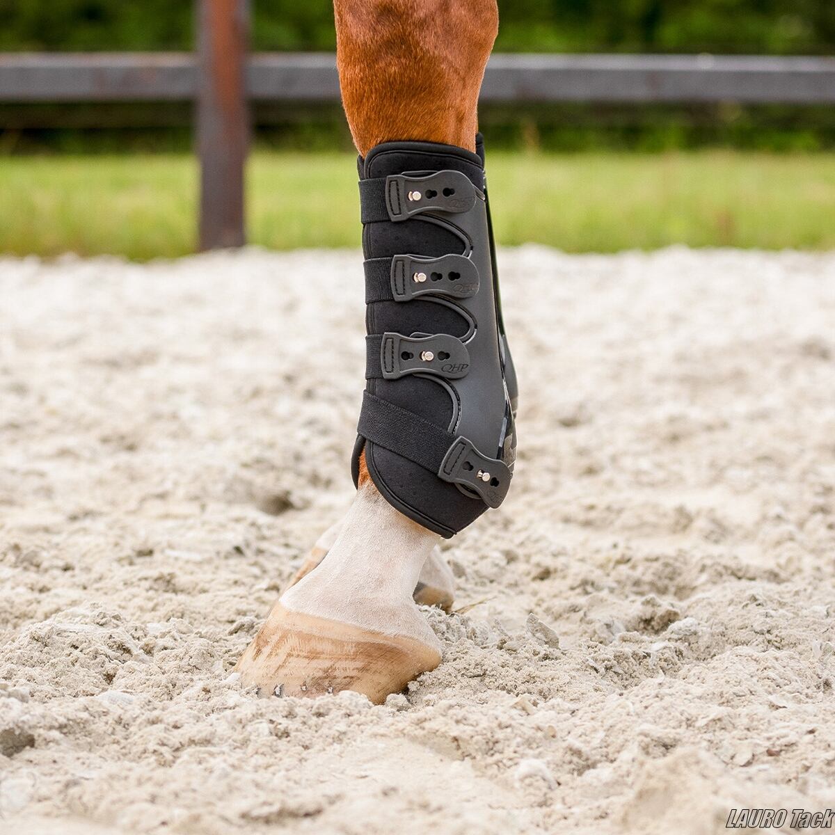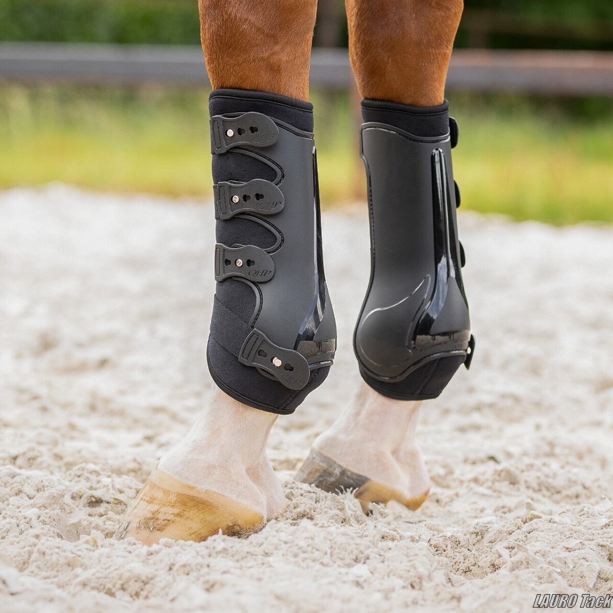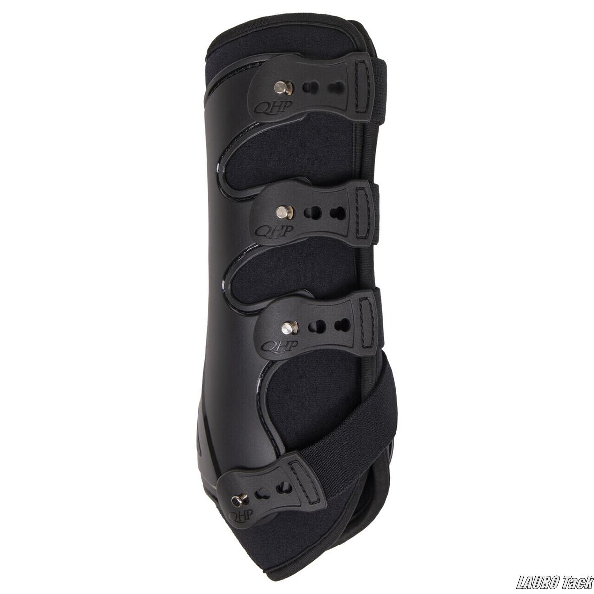 QHP「Champion」ブラッシングブーツは、前肢専用に設計されたスポーティーな脚用プロテクターで、伸縮性のあるクイックリリース式ベルトにより着脱が簡単です。外装には通気孔付きの丈夫なシェルを採用し、裏地のAirFlowネオプレン(微細な通気孔で熱と湿気を逃がすネオプレン)が優れた衝撃吸収性と快適性を提供します。解剖学的に成形されたシェルが高いフィット感を生み、外装素材にはTPU(耐久性と軽量性に優れた熱可塑性ポリウレタン)が使われています。