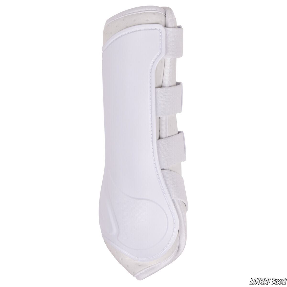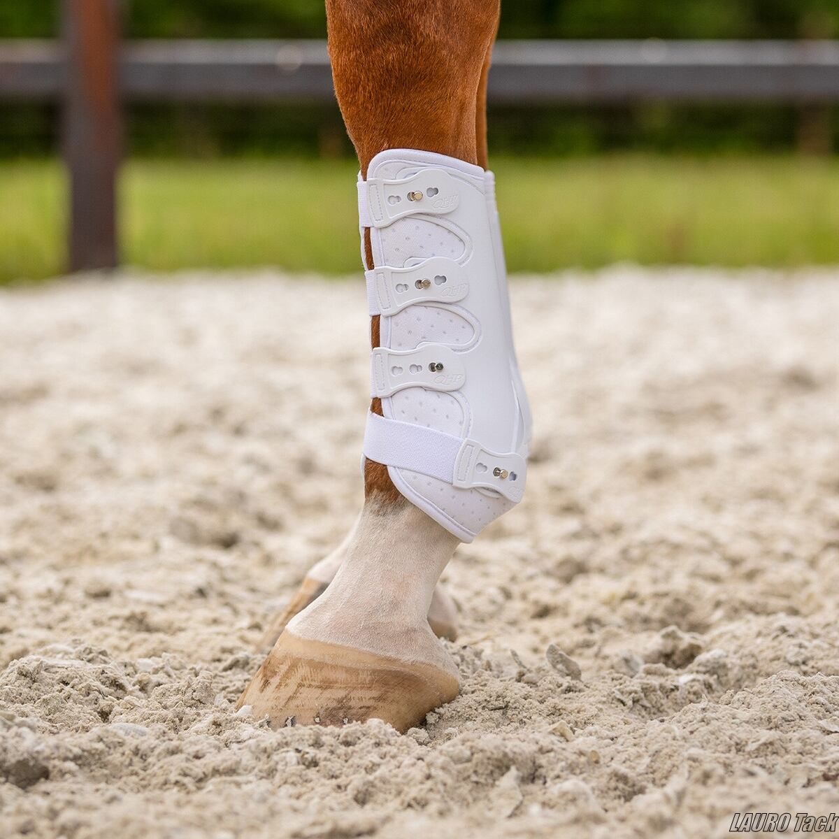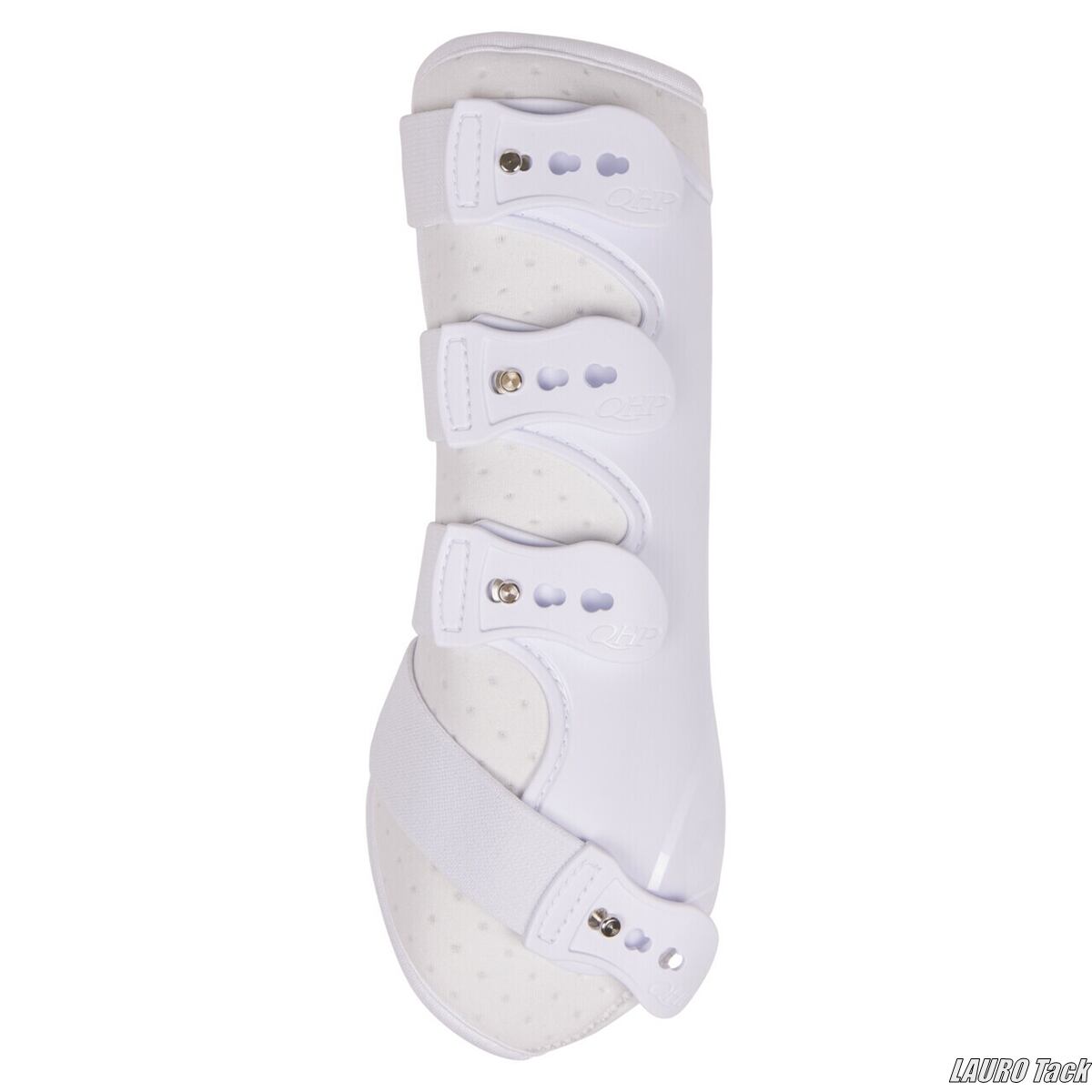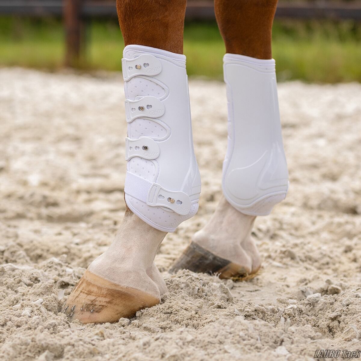 QHP「Champion」ブラッシングブーツは、前肢専用に作られた脚用プロテクターで、伸縮性のあるクイックリリース式ベルトによりスムーズに着脱できます。外装は通気孔付きの頑丈なシェルで、裏地にはAirFlowネオプレン(熱・湿気を効率よく逃がす通気構造のネオプレン)が使用され、高い衝撃吸収性と快適性を発揮します。解剖学的に成形されたシェルが優れたフィット感を生み、外装素材にはTPU(軽量で丈夫な熱可塑性ポリウレタン)が用いられています。