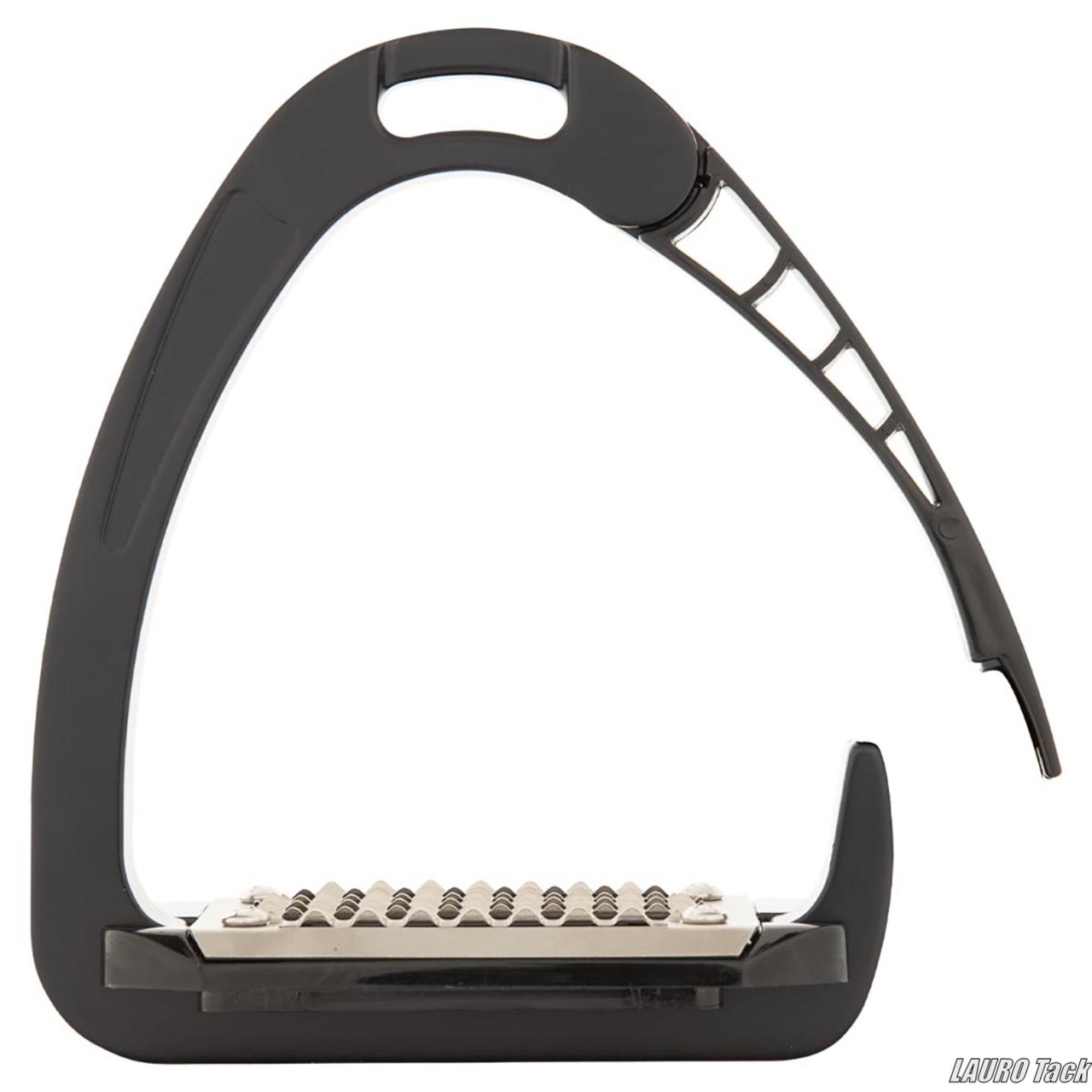 ヒンジ式の安全機構と小型フットストッパーを備えたジュニア向け安全鐙です。ライダーの体重がかかることで落馬時に鐙が開き、足が引っかかるリスクを軽減します。踏み面にはステンレス製の幅広ソールを採用し、細かな凹凸が高いグリップ力を発揮します。斜めに設計された吊り下げ部が鐙の位置を安定させ、足を正しい位置に保ちます。安全機構は必要なときのみ作動し、足が外れるとカチッと元の位置に戻る設計で、安定性と安全性を両立しています。