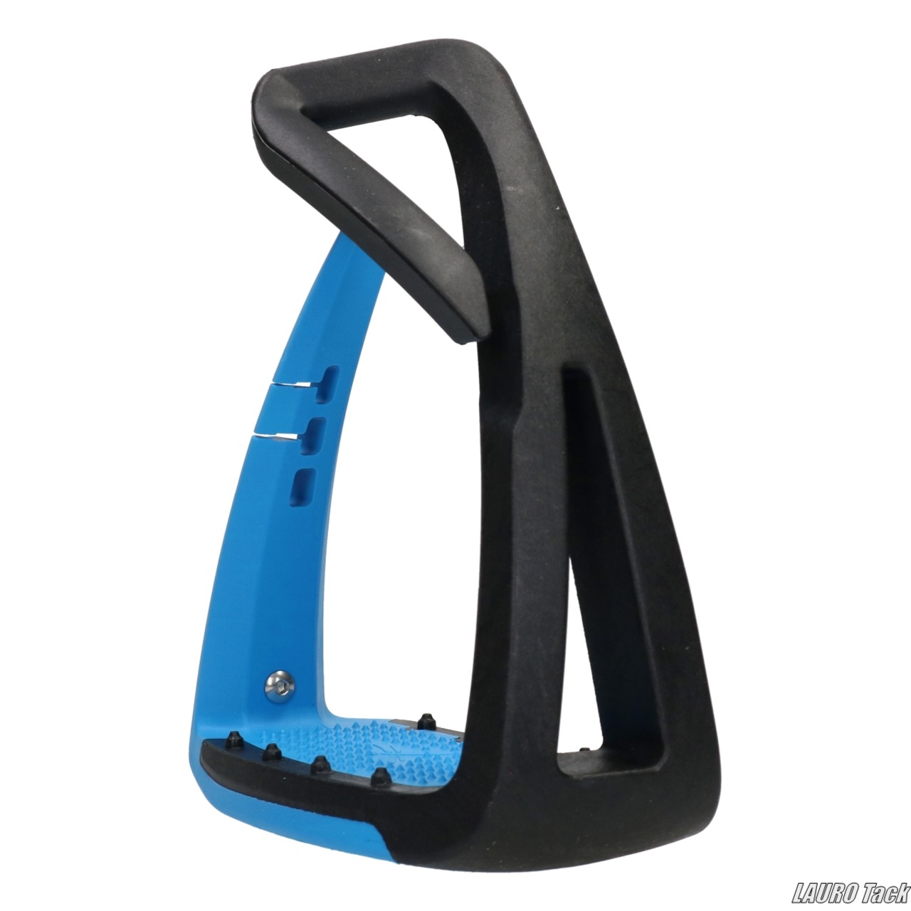 ジュニアおよび体重60kgまでの女性向けに設計された安全鐙です。軽量で強度の高いABS素材を使用し、幅広い踏み面が足裏を安定して支えます。スタッド付き踏み面は高い滑り止め効果を持ち、摩耗時には交換可能です。外側が圧力で開く安全構造により、落馬時の足抜けをサポートします。45度に角度のついた鐙革通しが自然な脚位置を導き、優れた衝撃吸収性とバランス性能を提供します。
