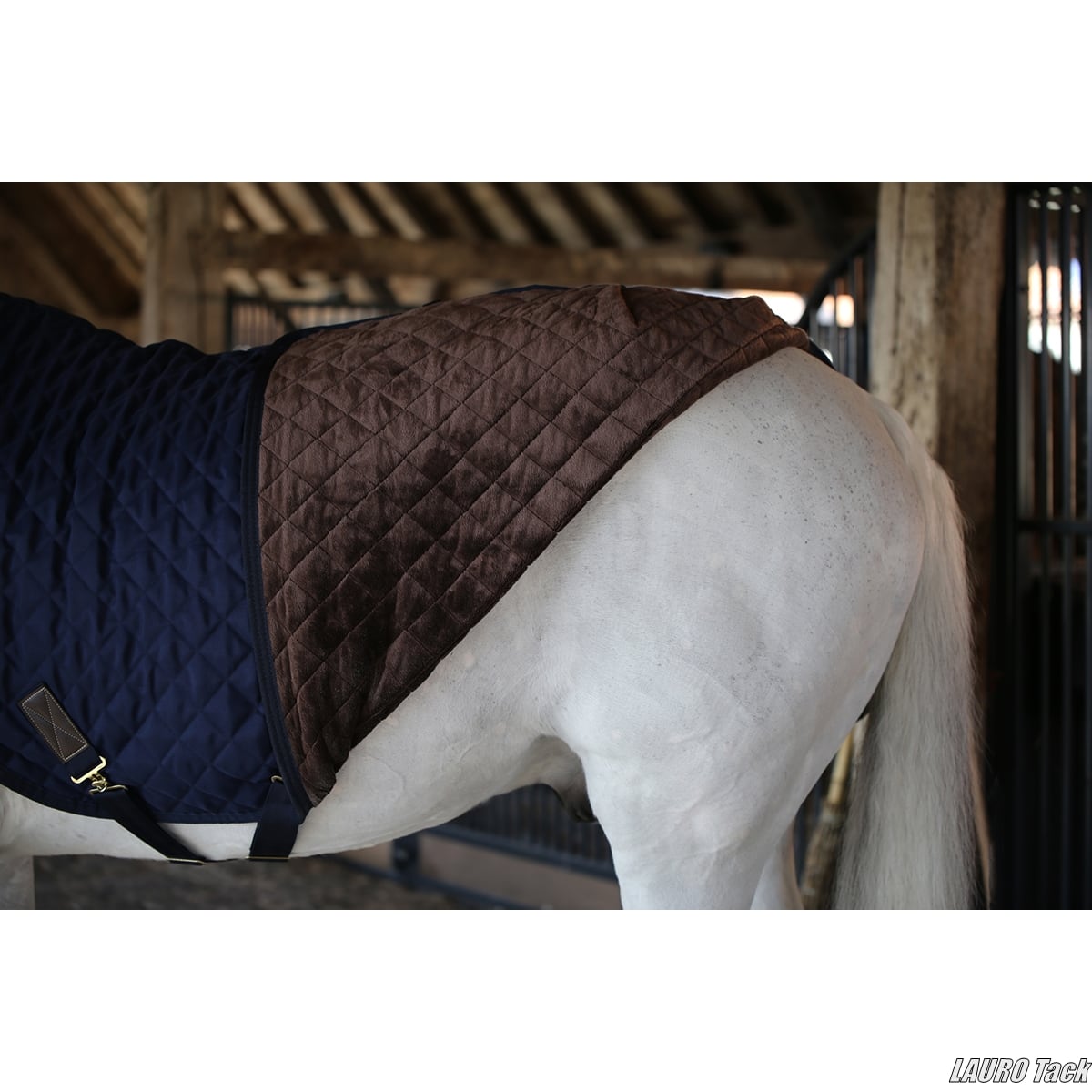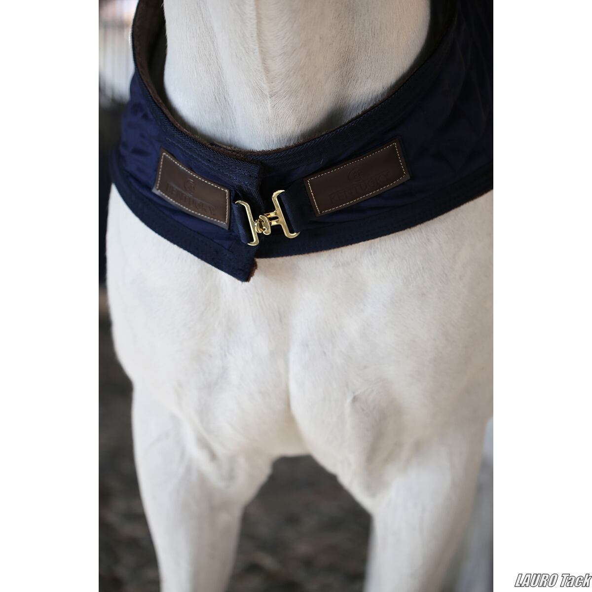 馬用ウォーキングマシーンや手引き運動に使用できるセラピー仕様のラグです。高めの胸元設計により可動域を妨げず、外側は撥水・通気性素材。内側には血行と酸素循環を促す特殊ライニングと、やわらかなステイドライ裏地を組み合わせています。胸元留め具1か所、腹帯2本、テールコード付きです。