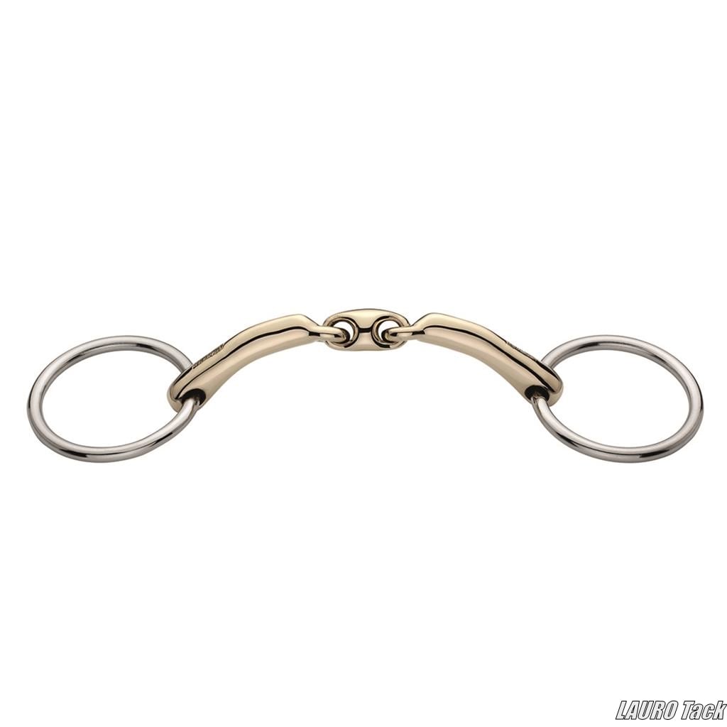 手に対して反発しやすい馬のために設計されたルーズリングタイプのハミです。楕円形の口金形状により、手が静かなときは舌との接触面が広がり、やさしく安定した当たりになります。手綱に圧がかかると口金が前方に傾き、合図がより明確に伝わる仕組みです。コンタクトが取りにくい馬に適しており、Sensogan素材を使用した快適な口当たりのハミです。太さは14mmです。