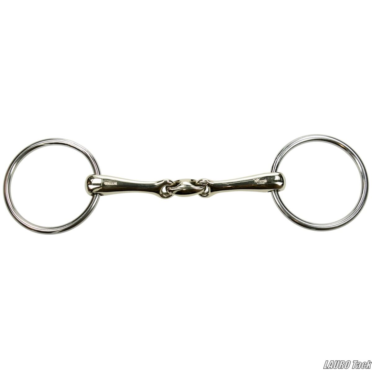 短めの中央部分を持つダブルジョイント構造のハミで、舌への圧迫を抑えつつ、はっきりとした合図を伝えやすい設計です。Sensogan素材を使用し、咀嚼を促しながら快適な装着感を保ちます。口の中で挟み込みにくく、敏感な口元の馬にも配慮された16mm厚のハミです。