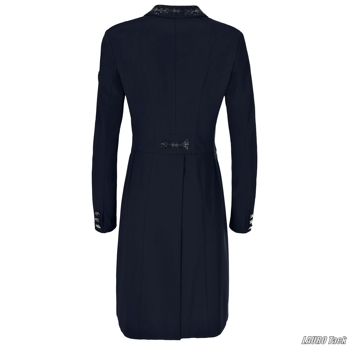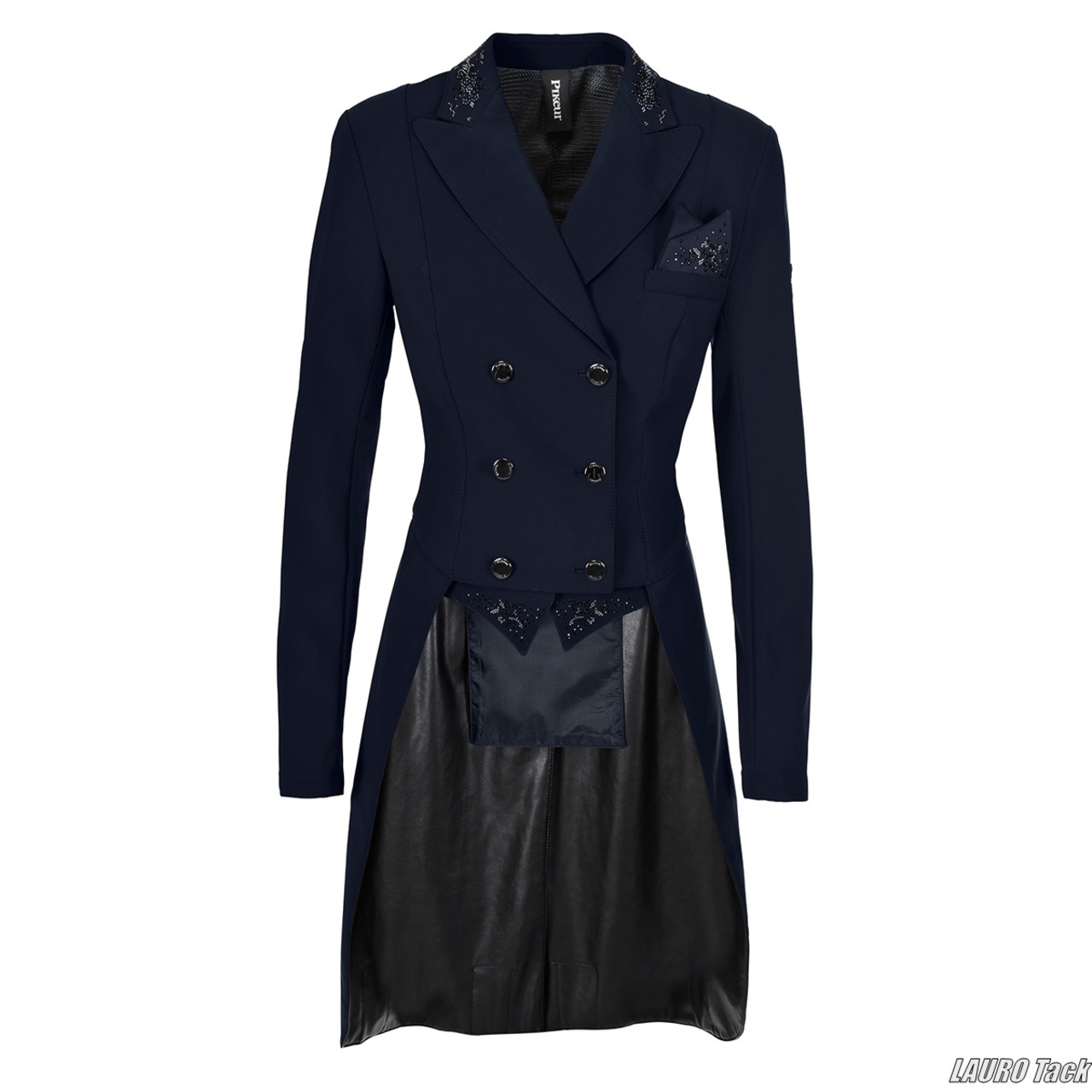 通気性と伸縮性に優れた素材を使用した、女性向けのエレガントな燕尾服です。身体に沿う女性らしいシルエットで、細身の袖が上品な印象を与えます。内側には通気性の高いメッシュ裏地を採用し、蒸れにくく快適です。襟元やウエスト後方のリボンにはラインストーン装飾が施され、袖口には装飾ボタンを配置しています。交換可能なポイントとポケットチーフ、裾のスリット部分には重りが内蔵され、騎乗中も美しいシルエットを保ちます。