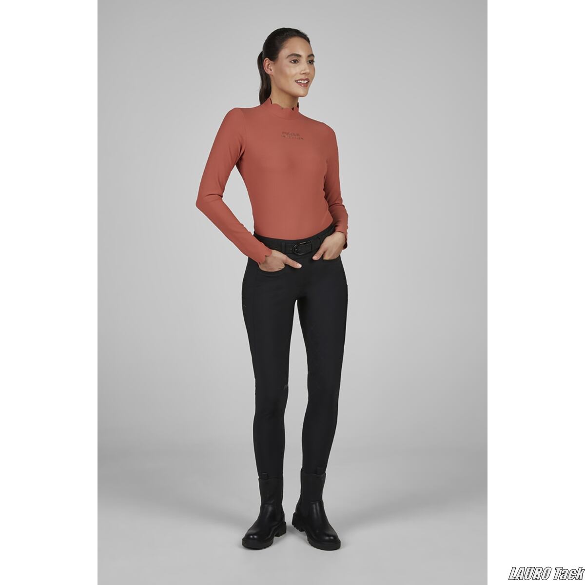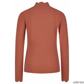 伸縮性のあるリブ素材を使用した、冬向けの長袖タートルネックシャツです。内側は起毛加工が施され、やわらかく暖かな着心地です。スタンドカラーと袖口は上品なデザインで、胸元にはさりげない装飾が施されています。