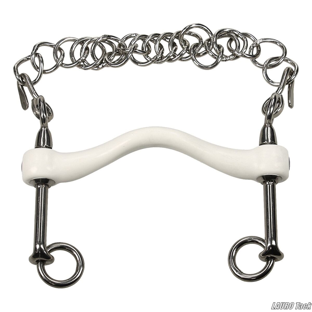 舌にスペースを確保するミディアムポート形状のウェイマスビット(ダブルブライドルで使用する下ハミ)です。やや柔軟性のある合成素材を使用し、舌中央への圧を軽減しつつ、主にバー部分に作用する設計です。厚みは20mmで、キュルブチェーンと併用します。上級馬場馬術での使用を前提としたビットで、素材はFDA認証済みの安全なプラスチックを使用しています。
