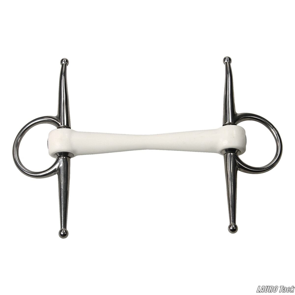 左右に縦の金属バー(チークアーム)を備えたフルチーク形状のストレートマウスピースビットです。合成素材のマウスピース内部にステンレス製コアを内蔵し、形状の安定性を確保しています。チークアーム構造により、ビットの横滑りを防ぎやすい設計です。厚みは20mmで、FDA認証素材を使用しています。