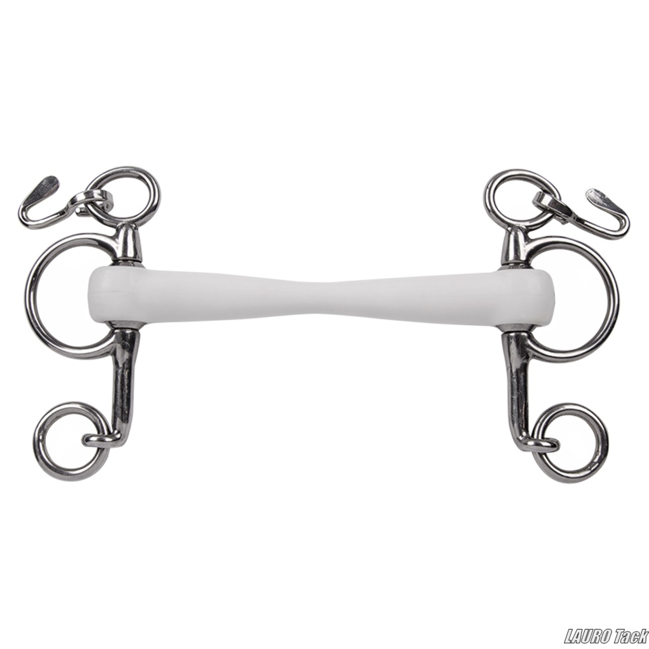 ペルハムビット(てこ作用を持つハミ)の一種であるベビーペルハムです。ストレート形状のマウスピースを持ち、短めのシャンク(てこ部分)を採用しています。シャンクが短いため、通常のペルハムよりもレバー作用が穏やかになる構造です。マウスピースは弾力性のあるFlexi Soft素材で、内部にステンレス製コアを内蔵し、形状の安定性を確保しています。主に舌に圧がかかる設計で、バーへの刺激が比較的少なく、口元が敏感な馬に配慮されています。厚みは20mmです。