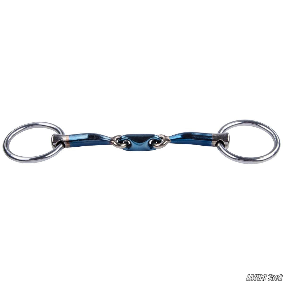 ブリドゥーン(ダブルブライドルで使用する上ハミ)です。ダブルジョイント構造で、丸みのある中央パーツを備えています。通常のルーズリングスナッフルよりリング径が小さく、マウスピースも細めに設計されています。舌とバーに圧が分散され、中央パーツが丸いため舌への局所的な圧が出にくい構造です。Sweet Iron素材を使用し、表面の酸化によって唾液分泌を促します。厚みは12mmで、上級馬場馬術において下ハミ(ウェイマス)と併用されます。